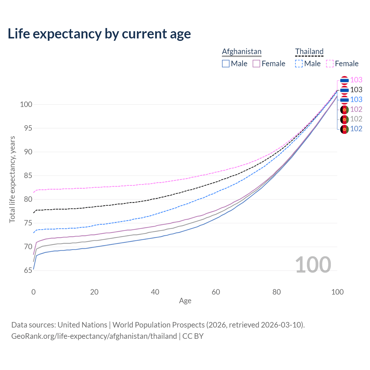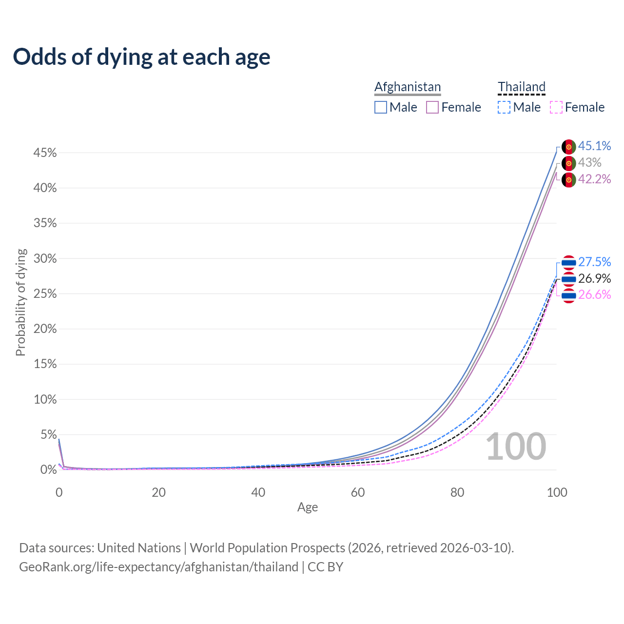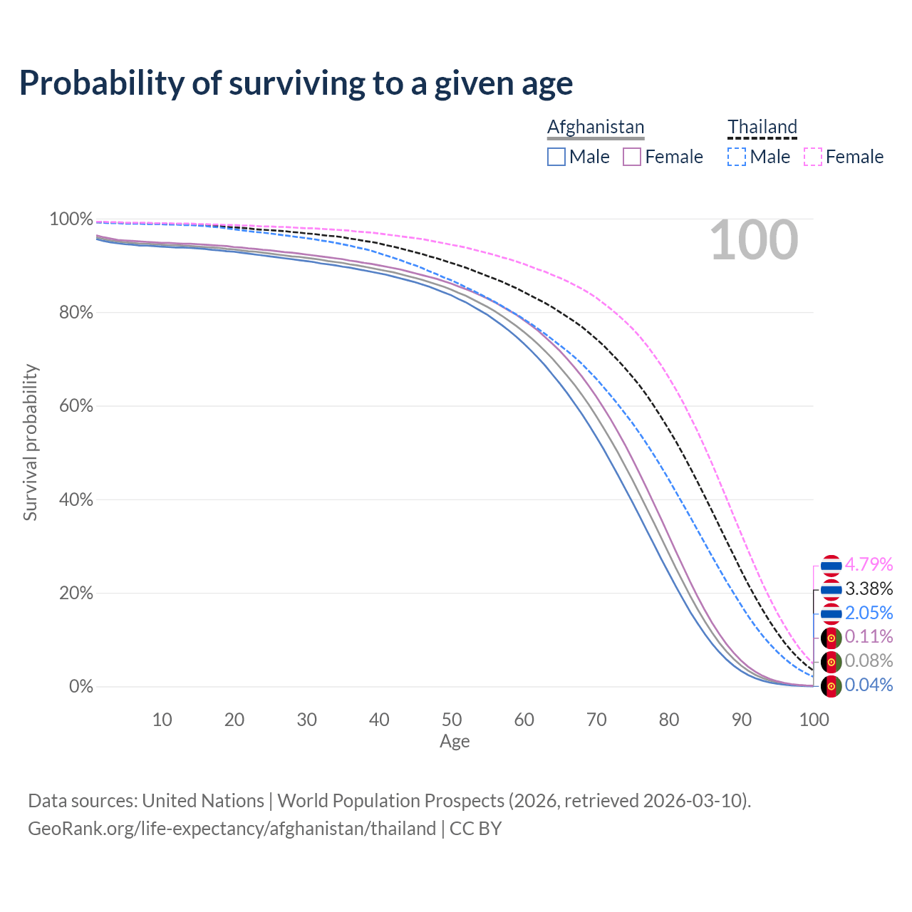 This life expectancy calculator shows the odds of living to 100, 95, 90, and below based on current age for both males and females in Afghanistan and Thailand, along with mean and median age of death. The calculations are based on the 2026 life tables (actuarial tables) from the UN World Population Prospects.