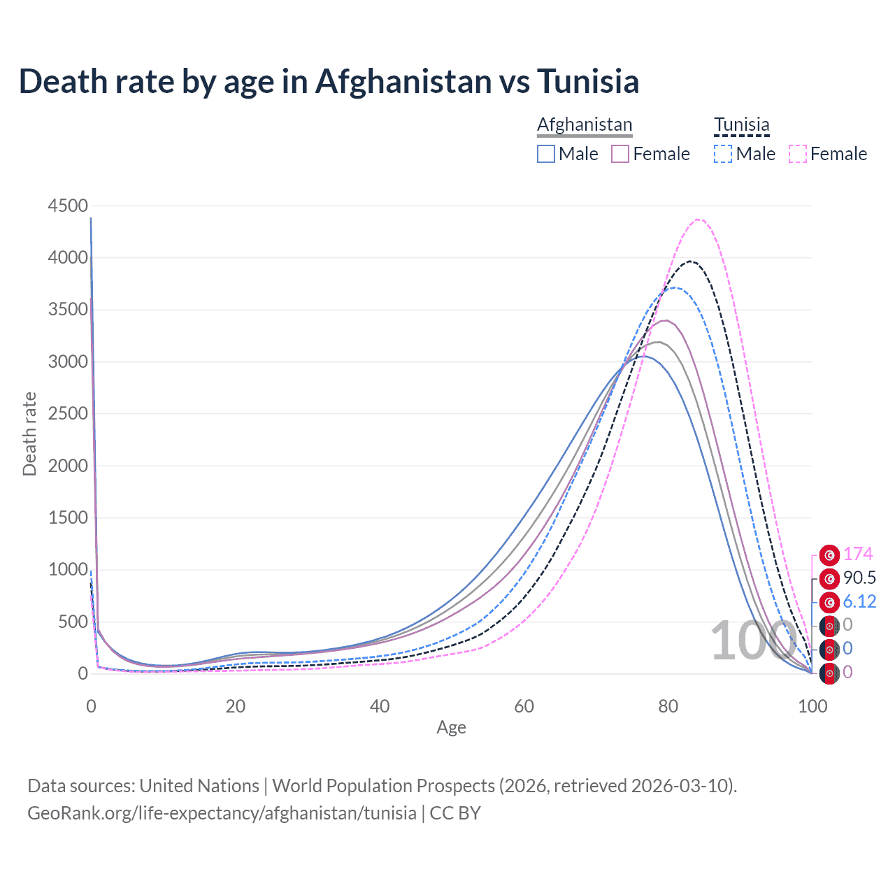 In Afghanistan, the most common age of death is 0, compared to 83 in Tunisia. The median age of death is 73 in Afghanistan and 80.2 in Tunisia, meaning only half of each cohort is expected to live past that age.
