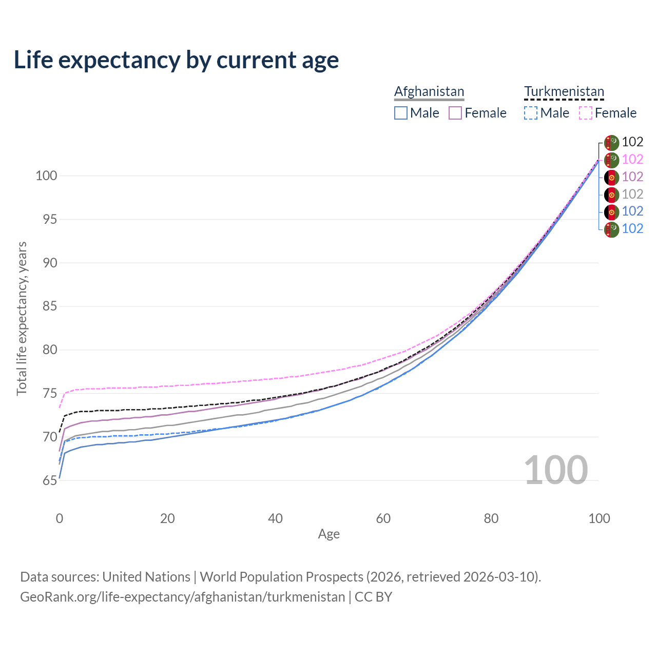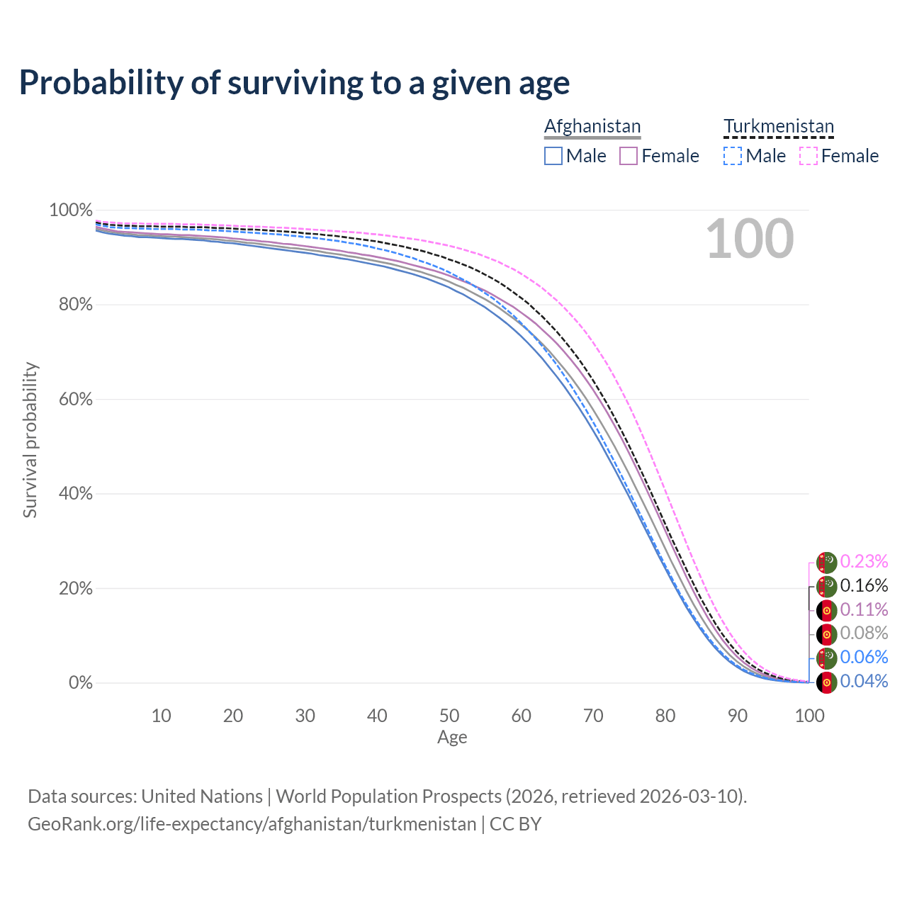 This life expectancy calculator shows the odds of living to 100, 95, 90, and below based on current age for both males and females in Afghanistan and Turkmenistan, along with mean and median age of death. The calculations are based on the 2026 life tables (actuarial tables) from the UN World Population Prospects.