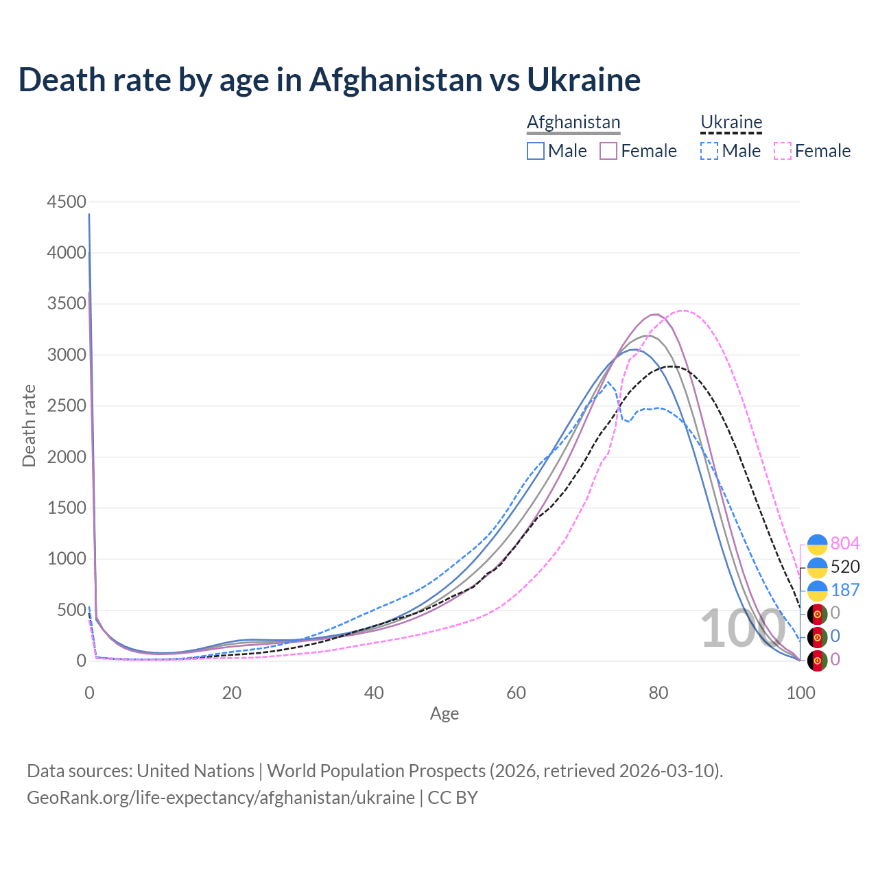 In Afghanistan, the most common age of death is 0, compared to 82 in Ukraine. The median age of death is 73 in Afghanistan and 78 in Ukraine, meaning only half of each cohort is expected to live past that age.