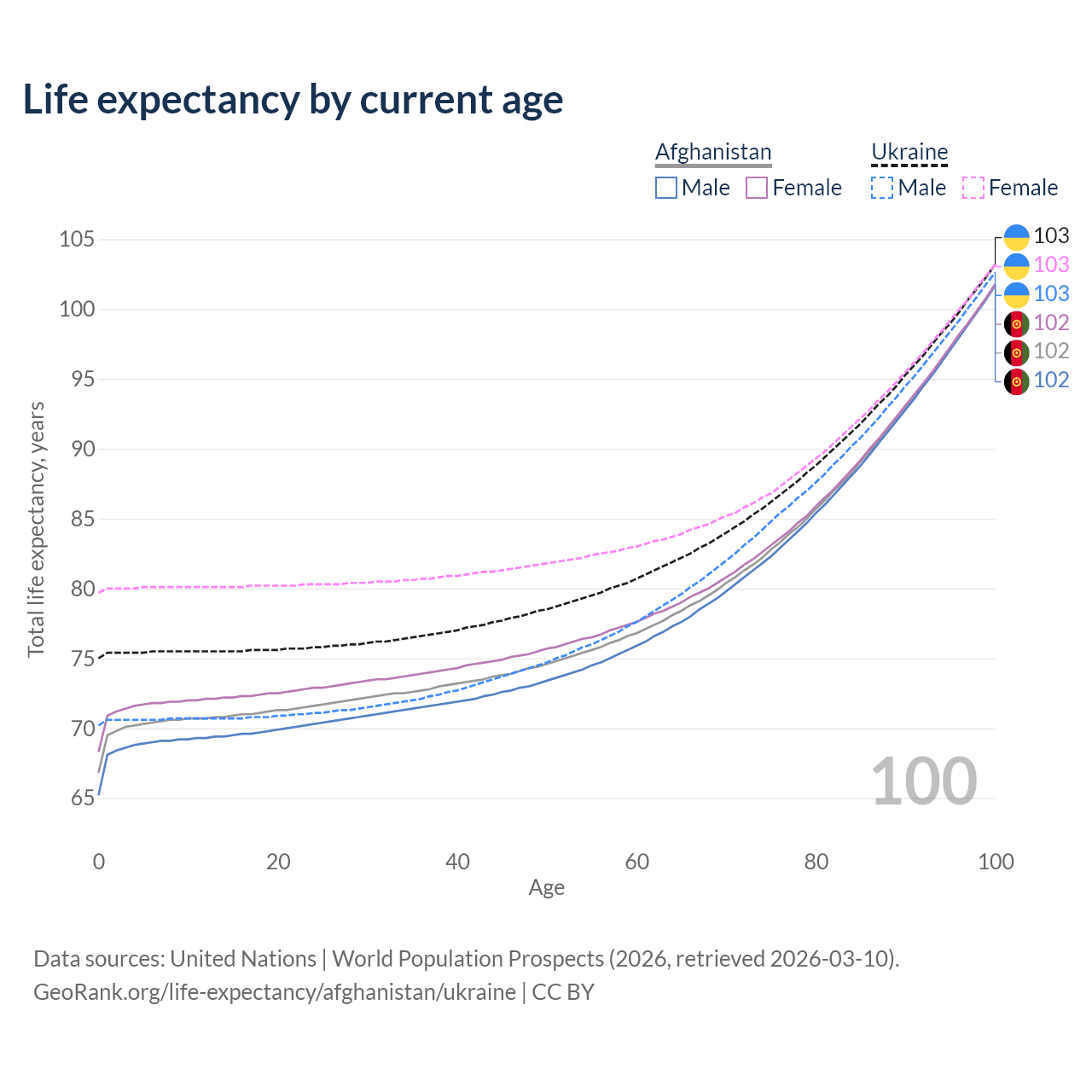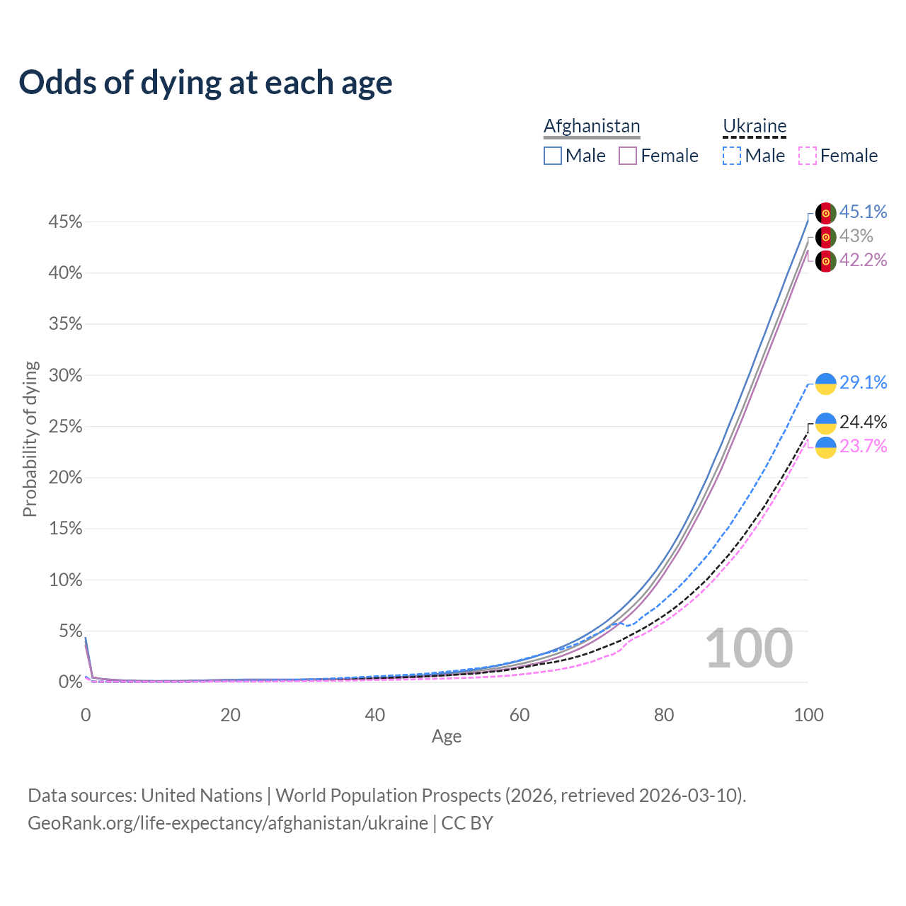 This life expectancy calculator shows the odds of living to 100, 95, 90, and below based on current age for both males and females in Afghanistan and Ukraine, along with mean and median age of death. The calculations are based on the 2026 life tables (actuarial tables) from the UN World Population Prospects.