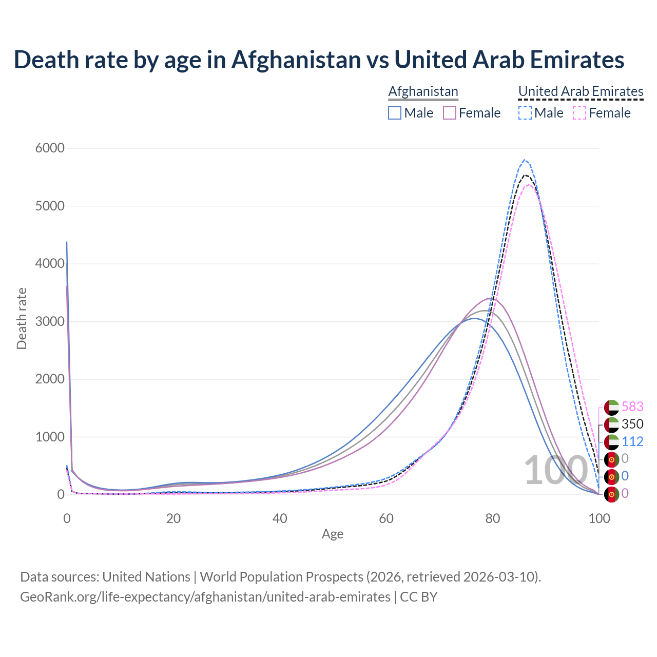 In Afghanistan, the most common age of death is 0, compared to 86 in the United Arab Emirates. The median age of death is 73 in Afghanistan and 85.6 in the United Arab Emirates, meaning only half of each cohort is expected to live past that age.