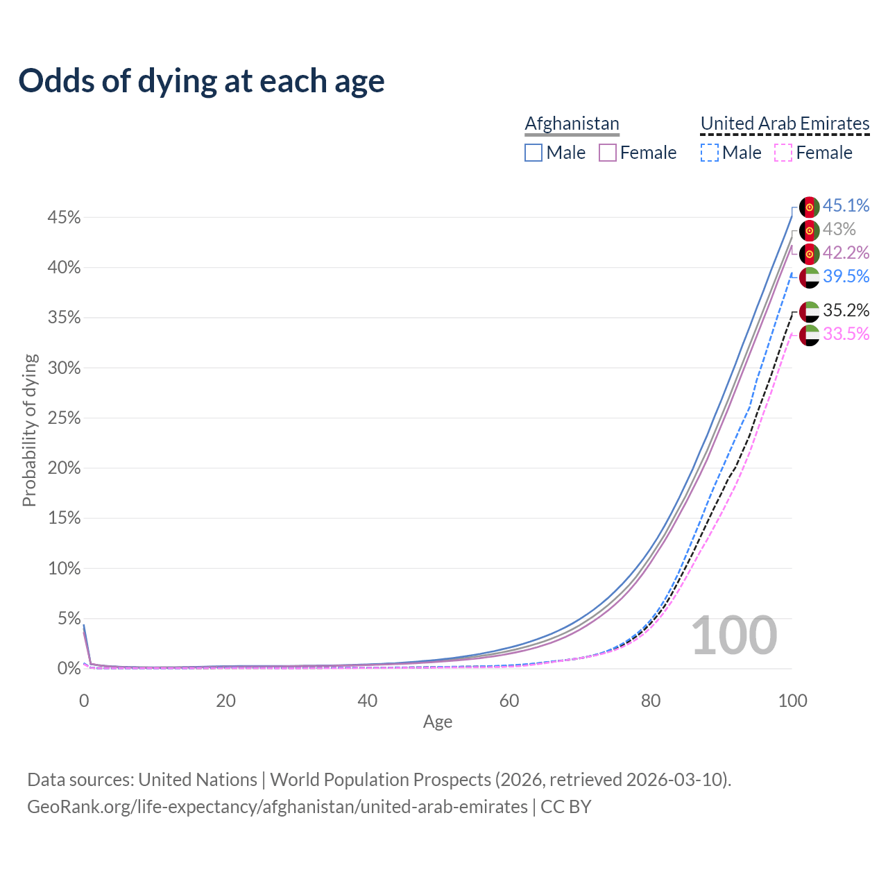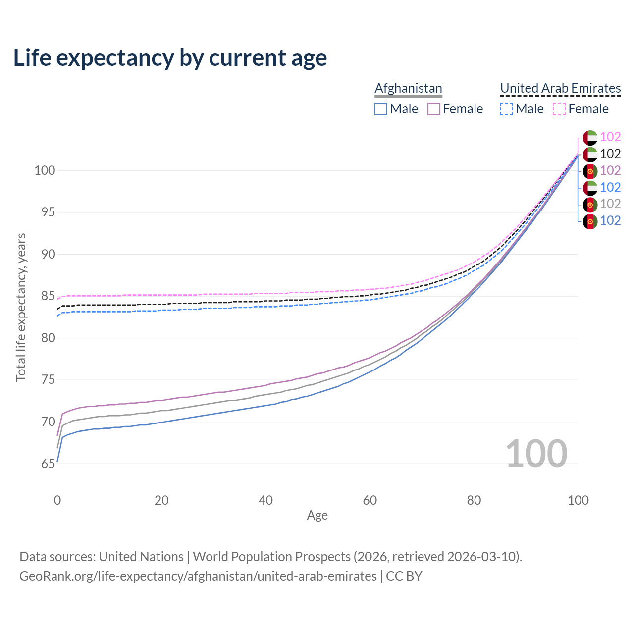 This life expectancy calculator shows the odds of living to 100, 95, 90, and below based on current age for both males and females in Afghanistan and the United Arab Emirates, along with mean and median age of death. The calculations are based on the 2026 life tables (actuarial tables) from the UN World Population Prospects.