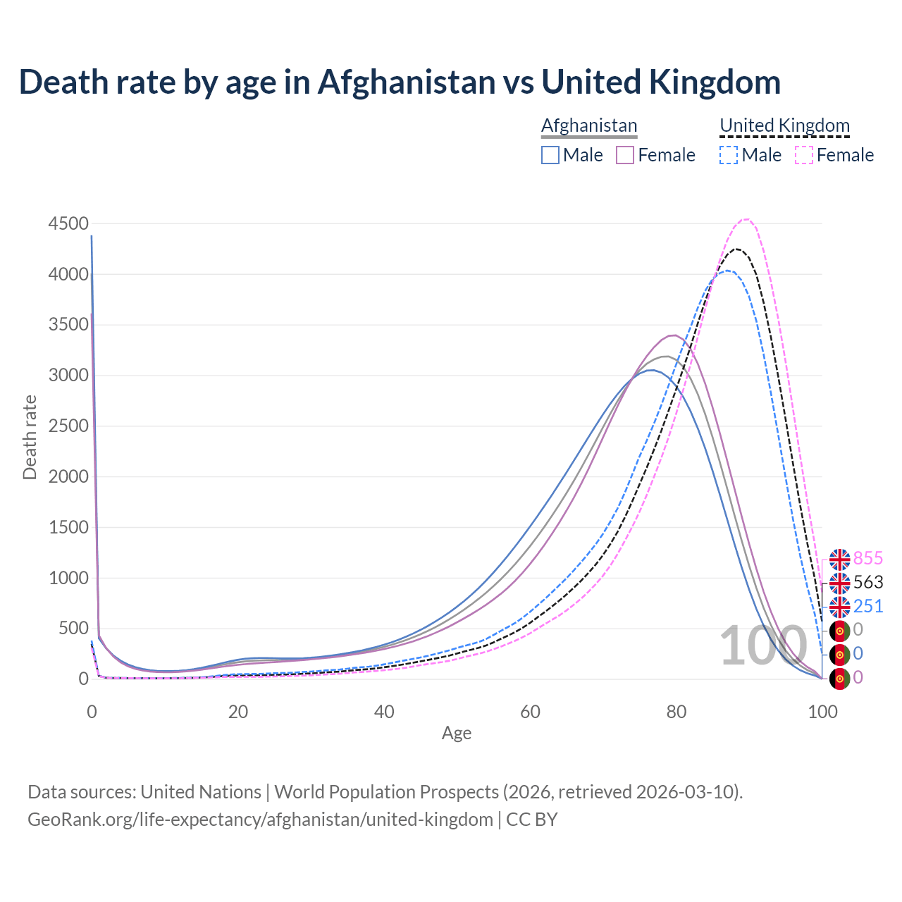 In Afghanistan, the most common age of death is 0, compared to 88 in the United Kingdom. The median age of death is 73 in Afghanistan and 84.9 in the United Kingdom, meaning only half of each cohort is expected to live past that age.