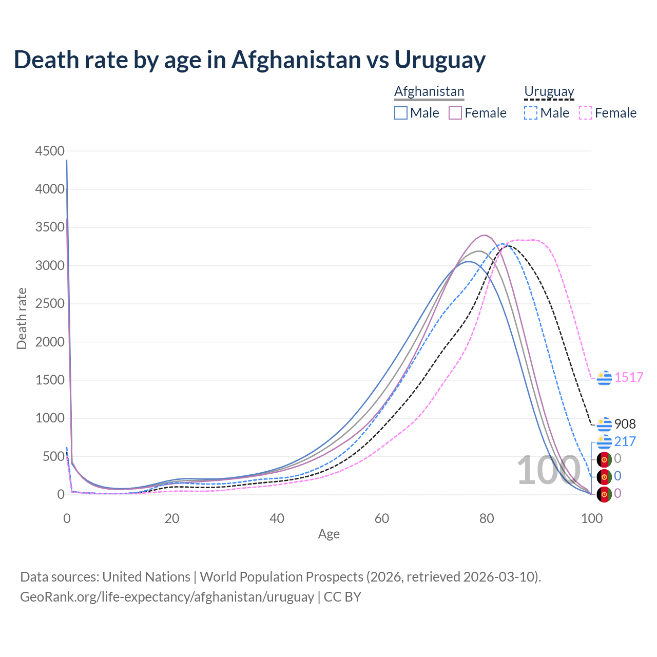 In Afghanistan, the most common age of death is 0, compared to 84 in Uruguay. The median age of death is 73 in Afghanistan and 81.8 in Uruguay, meaning only half of each cohort is expected to live past that age.