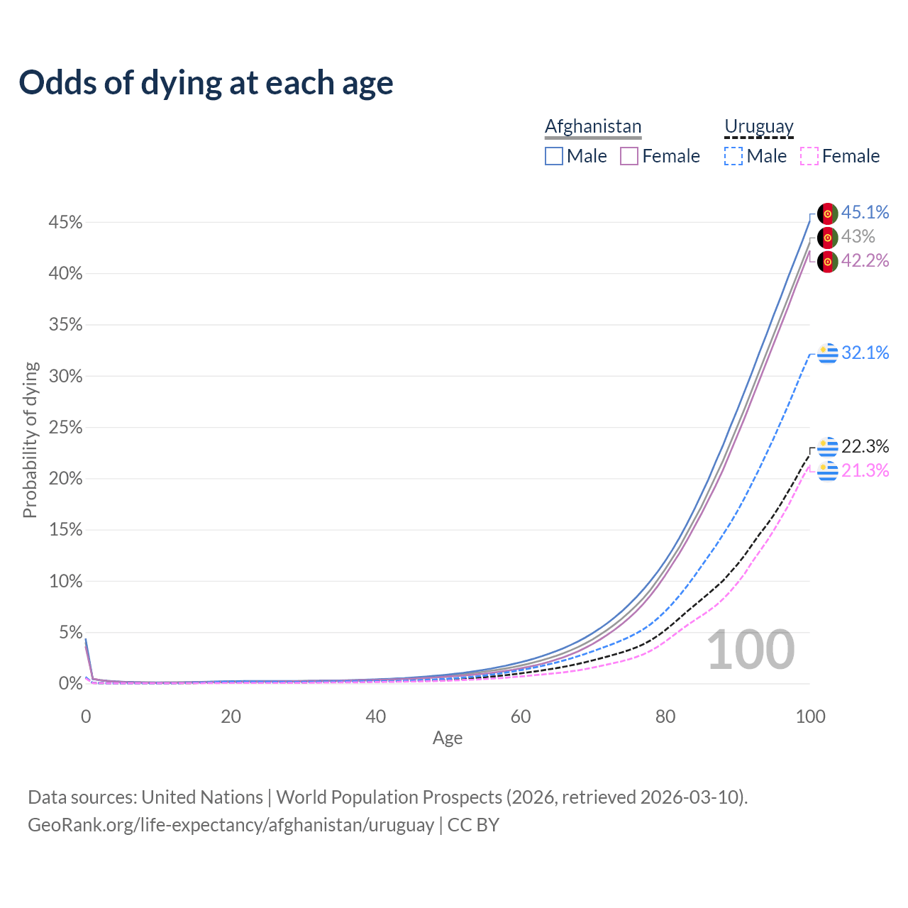 This life expectancy calculator shows the odds of living to 100, 95, 90, and below based on current age for both males and females in Afghanistan and Uruguay, along with mean and median age of death. The calculations are based on the 2026 life tables (actuarial tables) from the UN World Population Prospects.