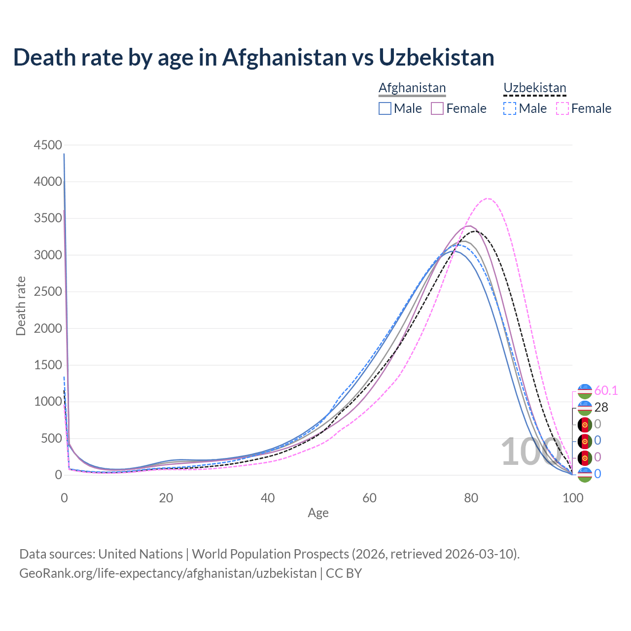 In Afghanistan, the most common age of death is 0, compared to 81 in Uzbekistan. The median age of death is 73 in Afghanistan and 76.4 in Uzbekistan, meaning only half of each cohort is expected to live past that age.