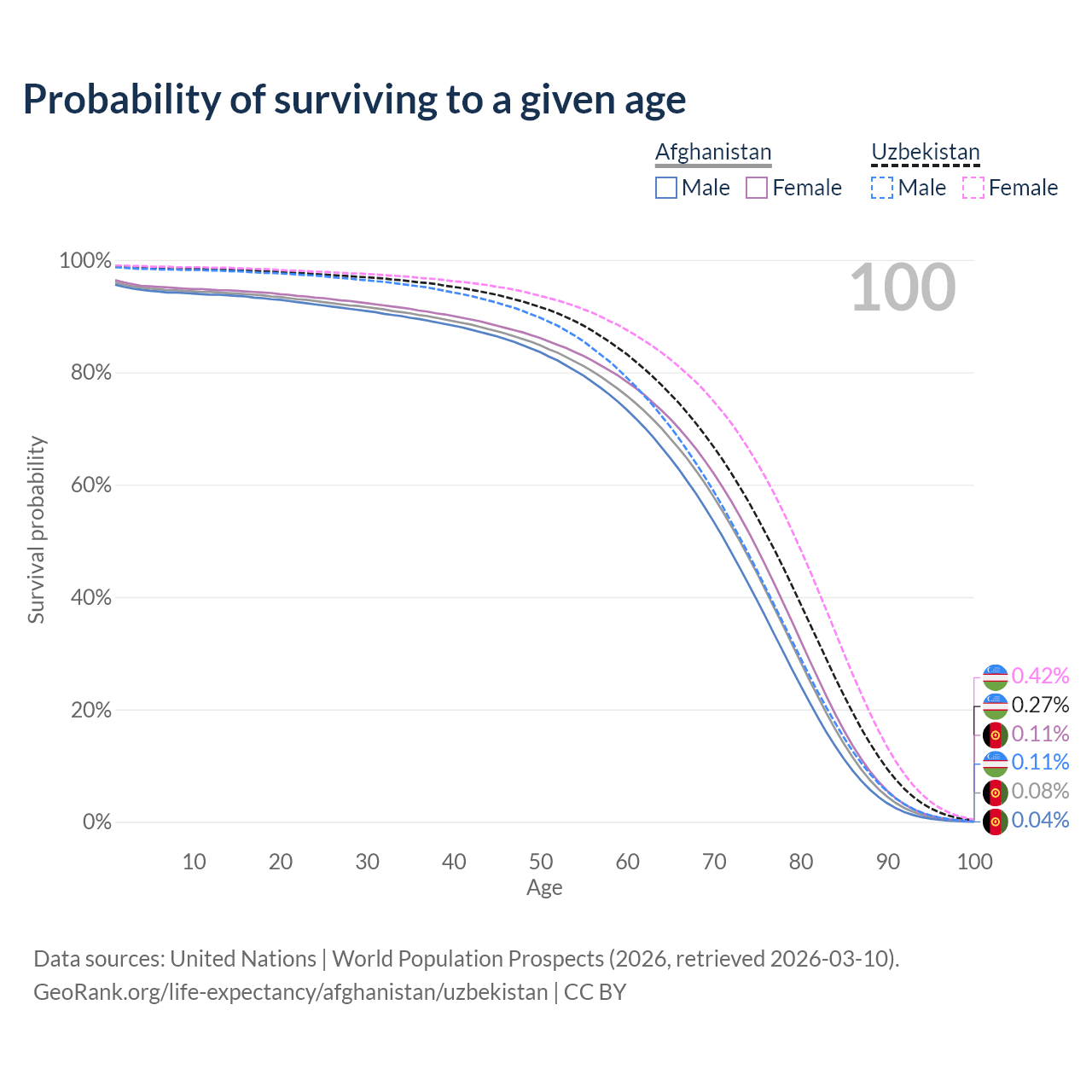 This life expectancy calculator shows the odds of living to 100, 95, 90, and below based on current age for both males and females in Afghanistan and Uzbekistan, along with mean and median age of death. The calculations are based on the 2026 life tables (actuarial tables) from the UN World Population Prospects.