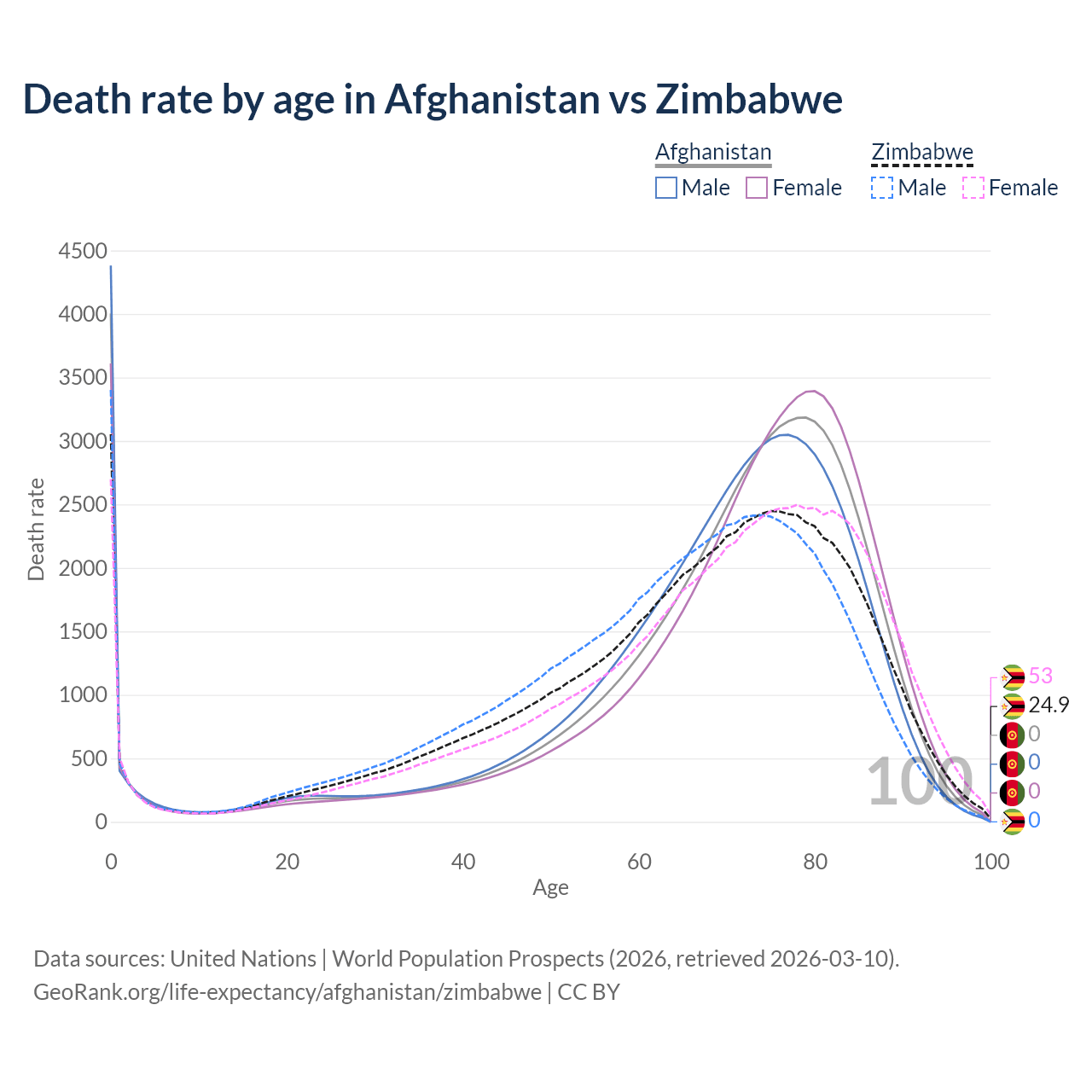 In Afghanistan, the most common age of death is 0, compared to 0 in Zimbabwe. The median age of death is 73 in Afghanistan and 68.8 in Zimbabwe, meaning only half of each cohort is expected to live past that age.