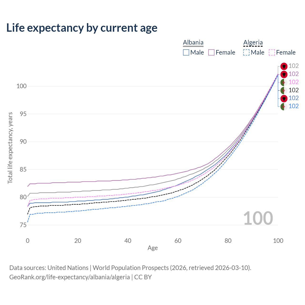 This life expectancy calculator shows the odds of living to 100, 95, 90, and below based on current age for both males and females in Albania and Algeria, along with mean and median age of death. The calculations are based on the 2026 life tables (actuarial tables) from the UN World Population Prospects.