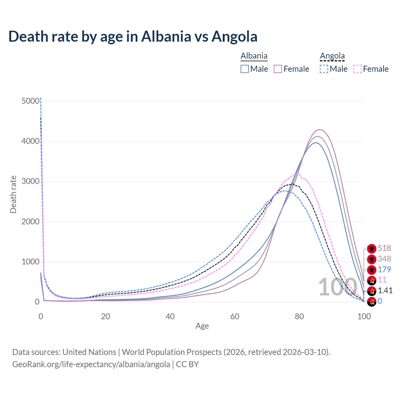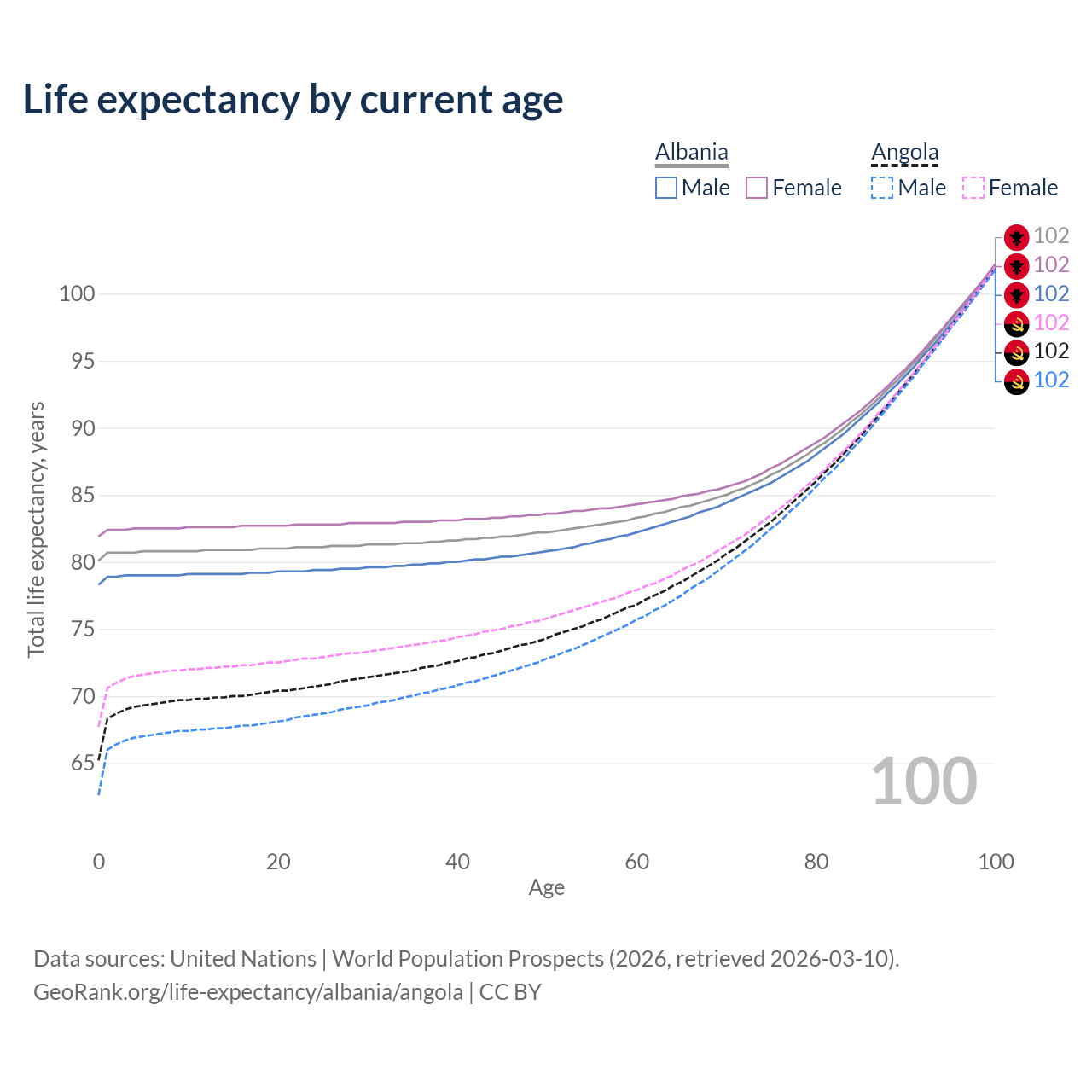 This life expectancy calculator shows the odds of living to 100, 95, 90, and below based on current age for both males and females in Albania and Angola, along with mean and median age of death. The calculations are based on the 2026 life tables (actuarial tables) from the UN World Population Prospects.