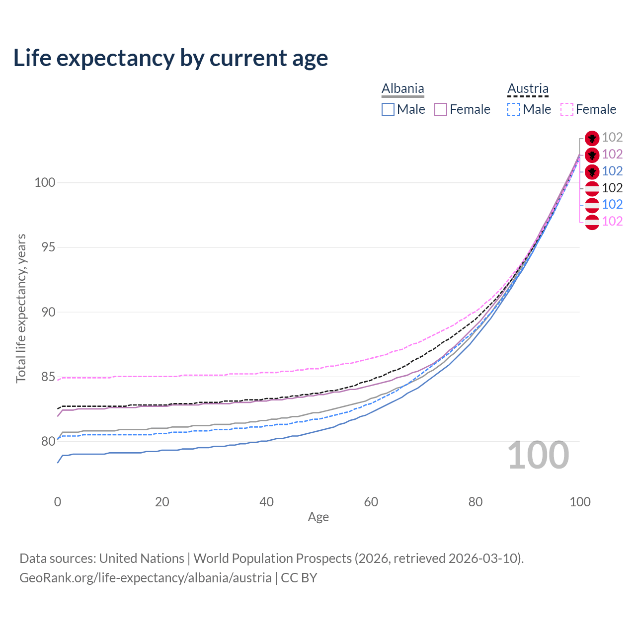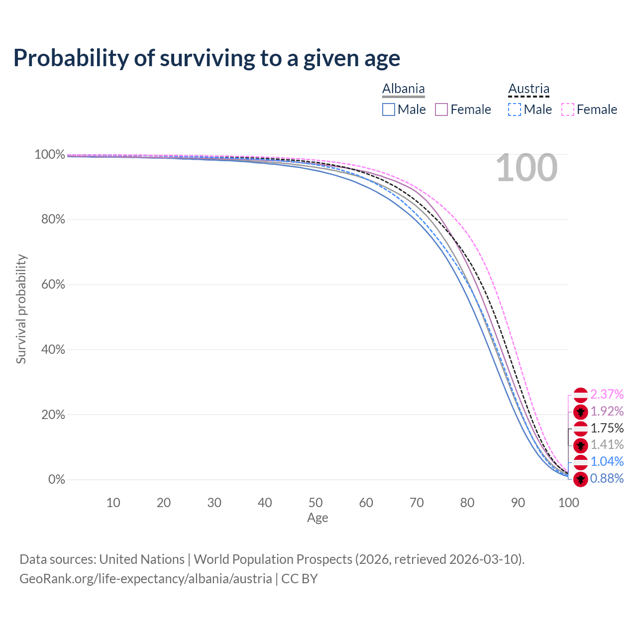 This life expectancy calculator shows the odds of living to 100, 95, 90, and below based on current age for both males and females in Albania and Austria, along with mean and median age of death. The calculations are based on the 2026 life tables (actuarial tables) from the UN World Population Prospects.