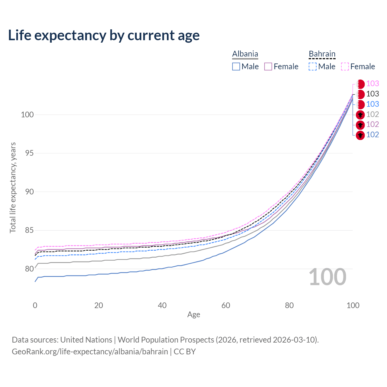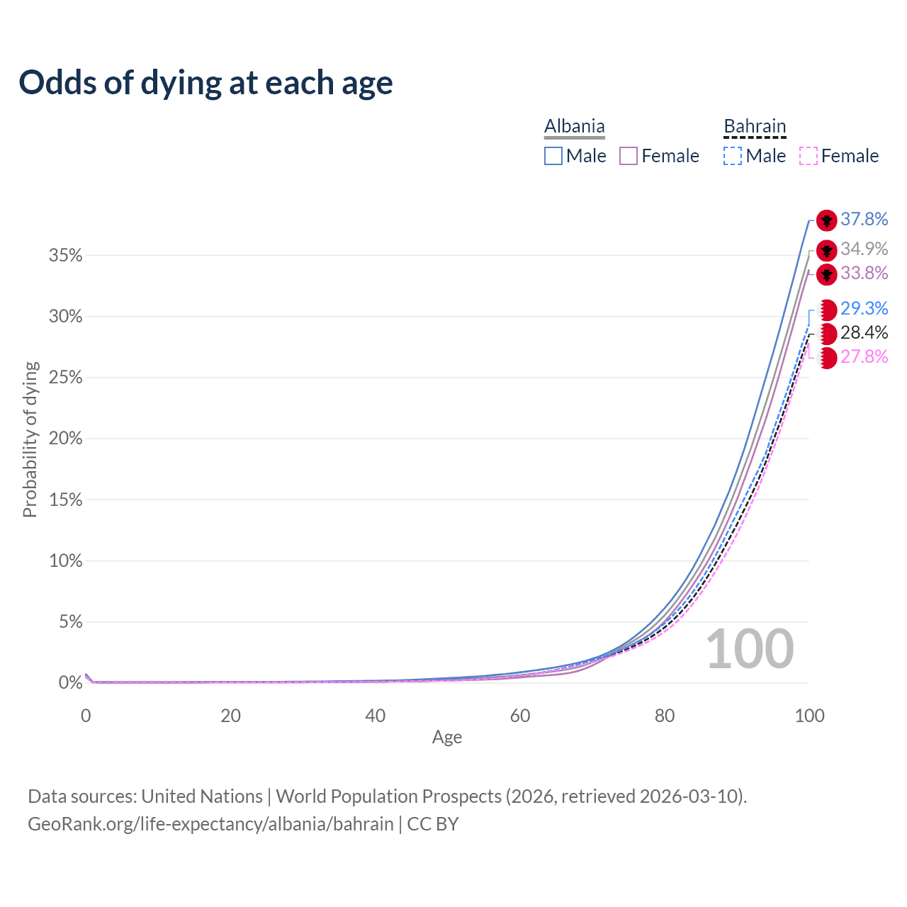This life expectancy calculator shows the odds of living to 100, 95, 90, and below based on current age for both males and females in Albania and Bahrain, along with mean and median age of death. The calculations are based on the 2026 life tables (actuarial tables) from the UN World Population Prospects.