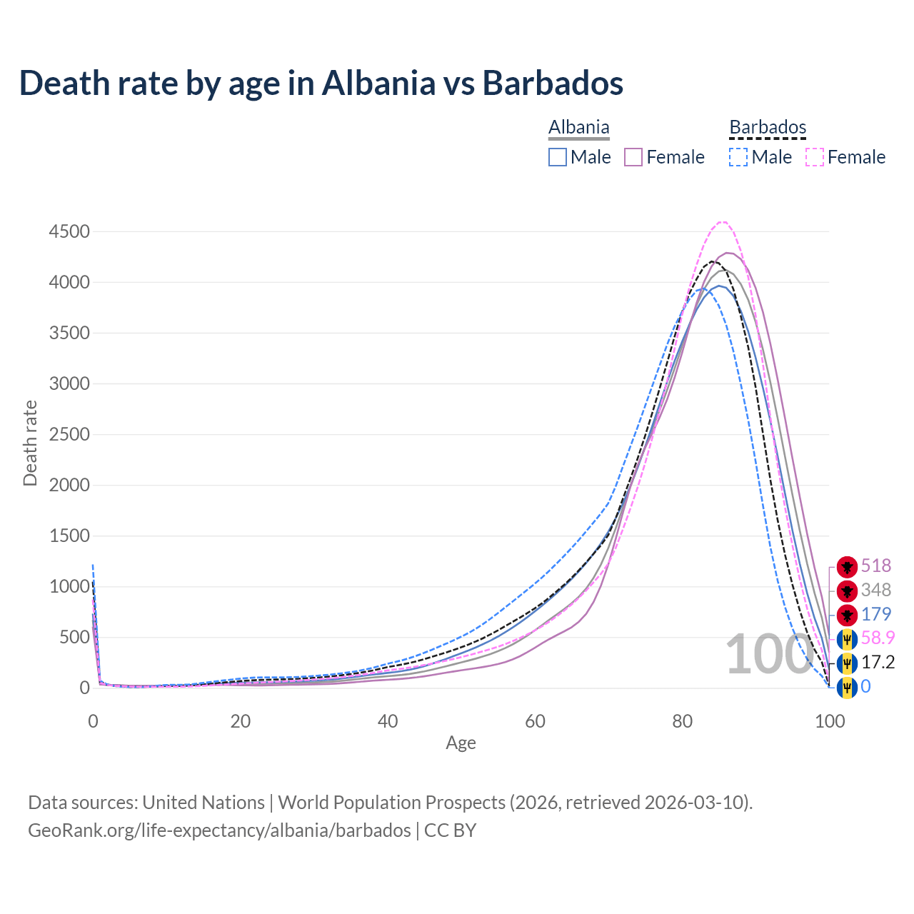 In Albania, the most common age of death is 86, compared to 84 in Barbados. The median age of death is 83.2 in Albania and 80.8 in Barbados, meaning only half of each cohort is expected to live past that age.