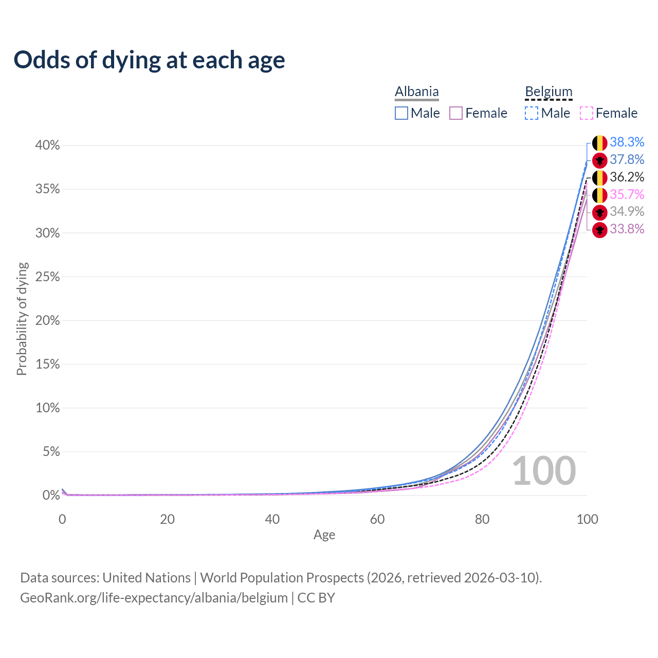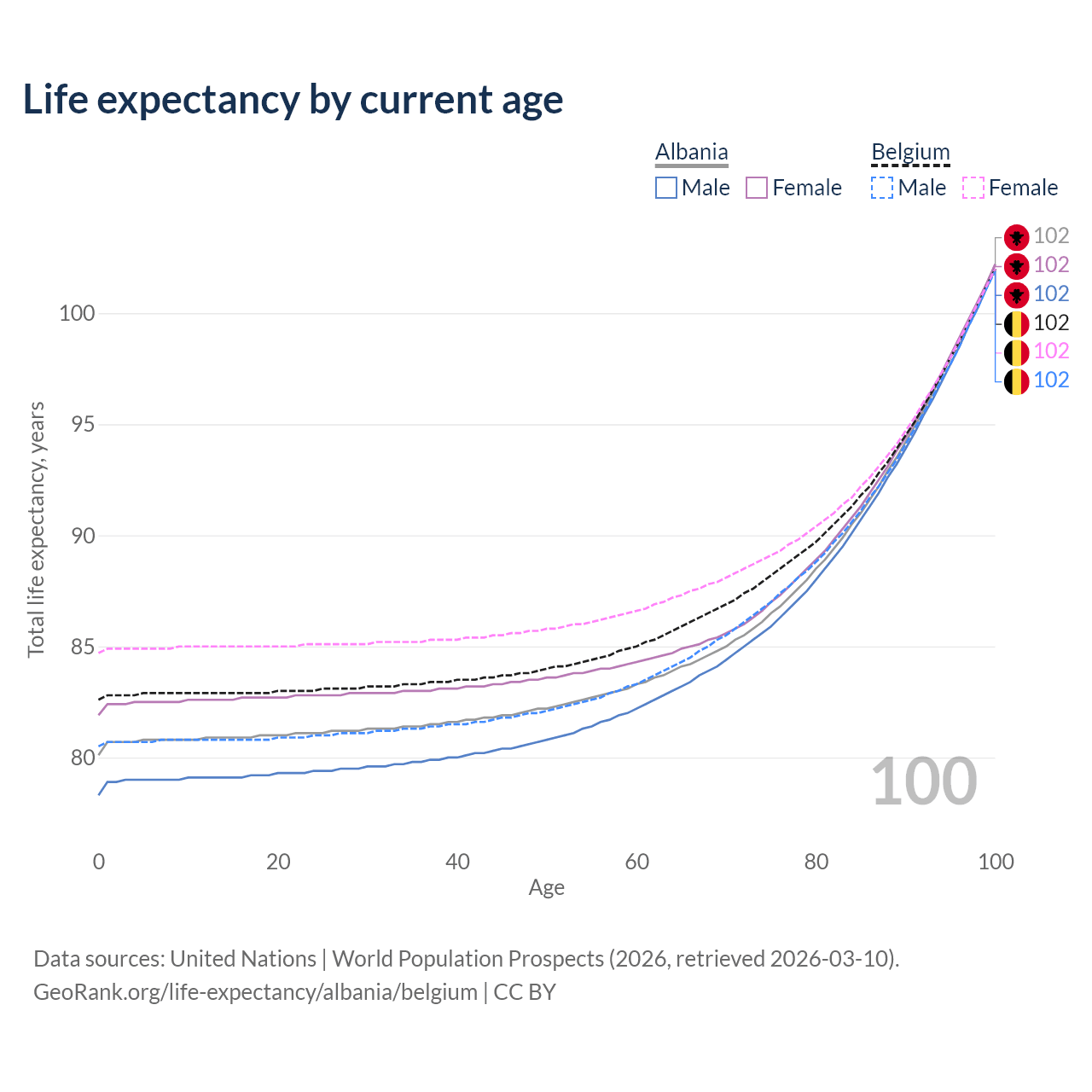 This life expectancy calculator shows the odds of living to 100, 95, 90, and below based on current age for both males and females in Albania and Belgium, along with mean and median age of death. The calculations are based on the 2026 life tables (actuarial tables) from the UN World Population Prospects.