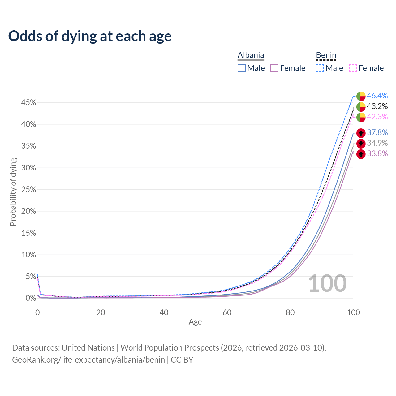 This life expectancy calculator shows the odds of living to 100, 95, 90, and below based on current age for both males and females in Albania and Benin, along with mean and median age of death. The calculations are based on the 2026 life tables (actuarial tables) from the UN World Population Prospects.
