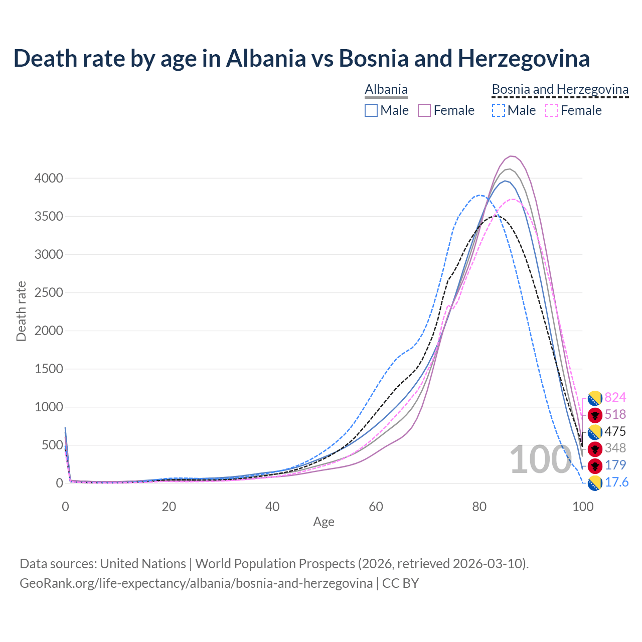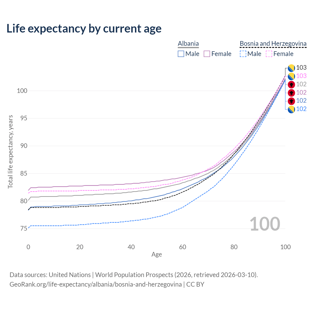This life expectancy calculator shows the odds of living to 100, 95, 90, and below based on current age for both males and females in Albania and Bosnia and Herzegovina, along with mean and median age of death. The calculations are based on the 2026 life tables (actuarial tables) from the UN World Population Prospects.