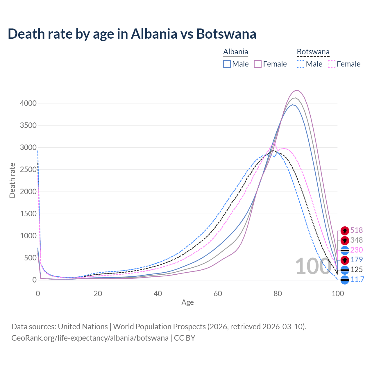 In Albania, the most common age of death is 86, compared to 79 in Botswana. The median age of death is 83.2 in Albania and 74.4 in Botswana, meaning only half of each cohort is expected to live past that age.
