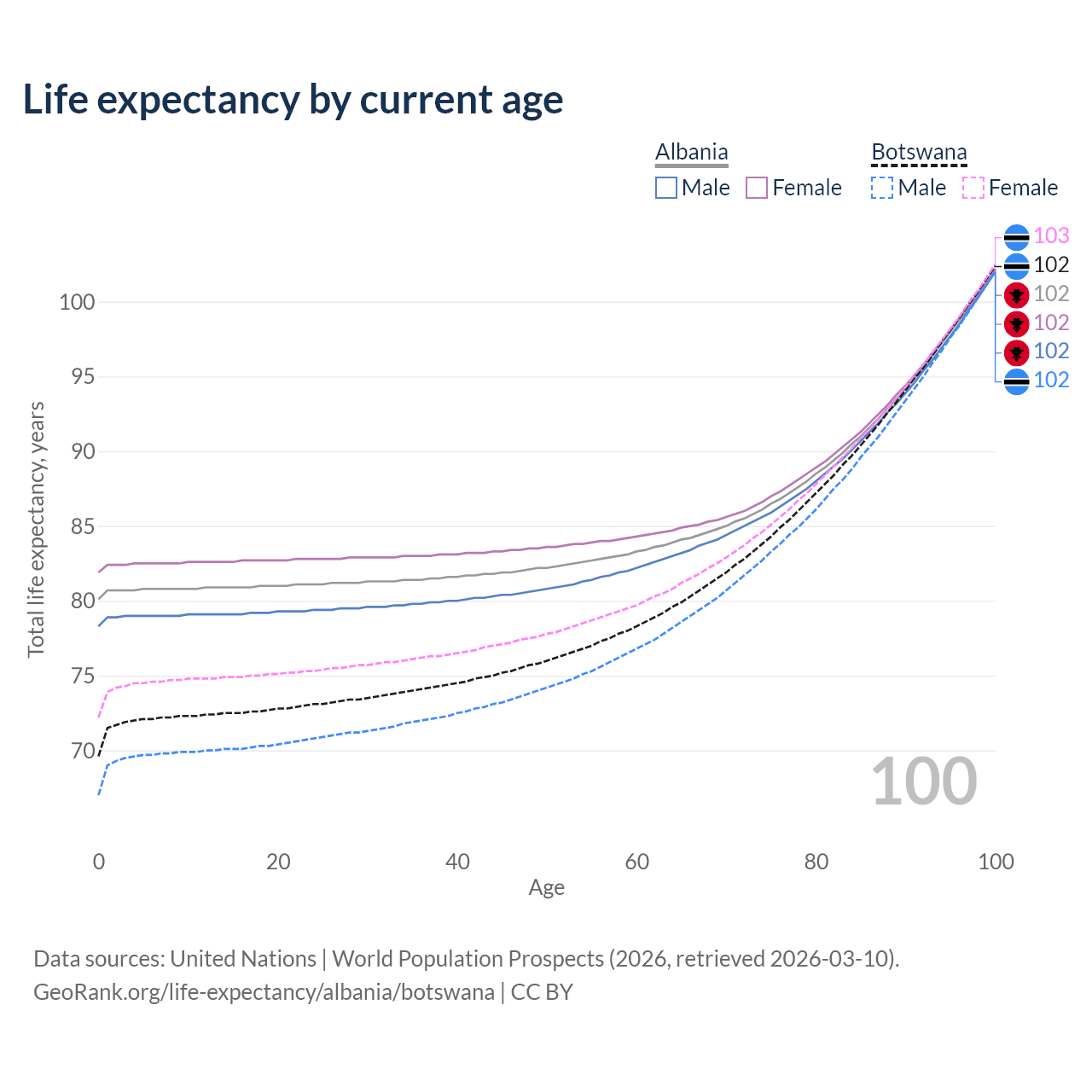This life expectancy calculator shows the odds of living to 100, 95, 90, and below based on current age for both males and females in Albania and Botswana, along with mean and median age of death. The calculations are based on the 2026 life tables (actuarial tables) from the UN World Population Prospects.