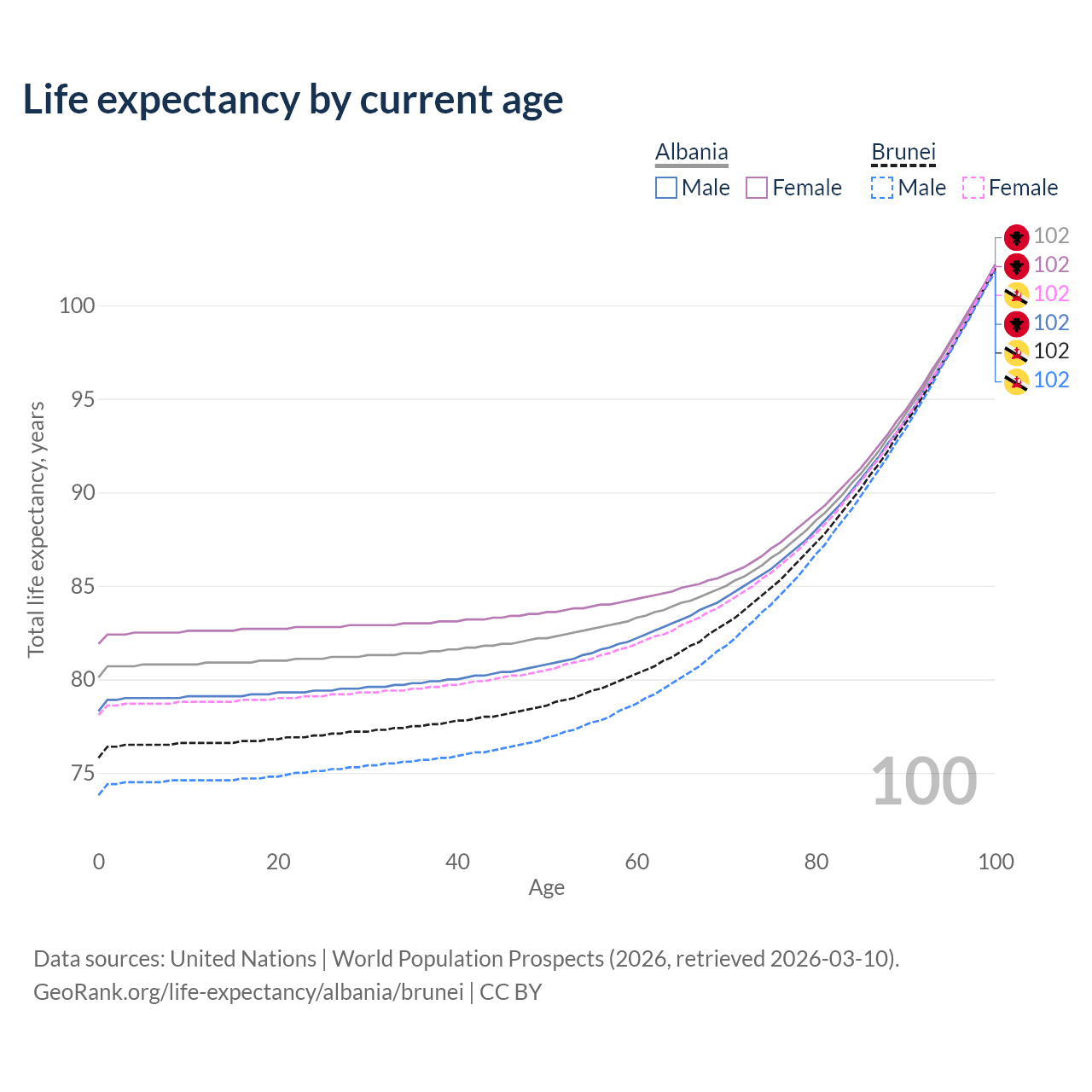 This life expectancy calculator shows the odds of living to 100, 95, 90, and below based on current age for both males and females in Albania and Brunei, along with mean and median age of death. The calculations are based on the 2026 life tables (actuarial tables) from the UN World Population Prospects.