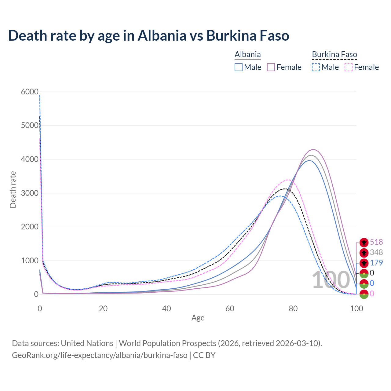 In Albania, the most common age of death is 86, compared to 0 in Burkina Faso. The median age of death is 83.2 in Albania and 70.4 in Burkina Faso, meaning only half of each cohort is expected to live past that age.