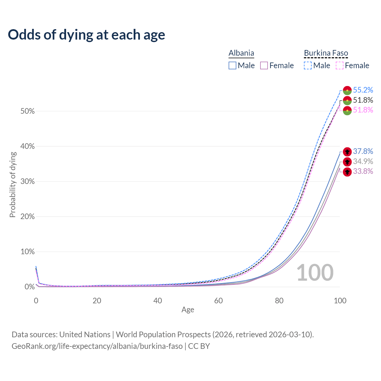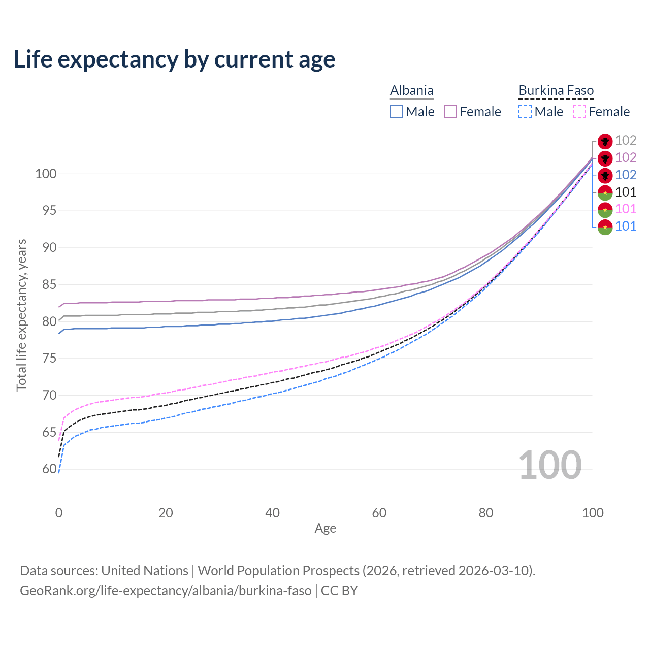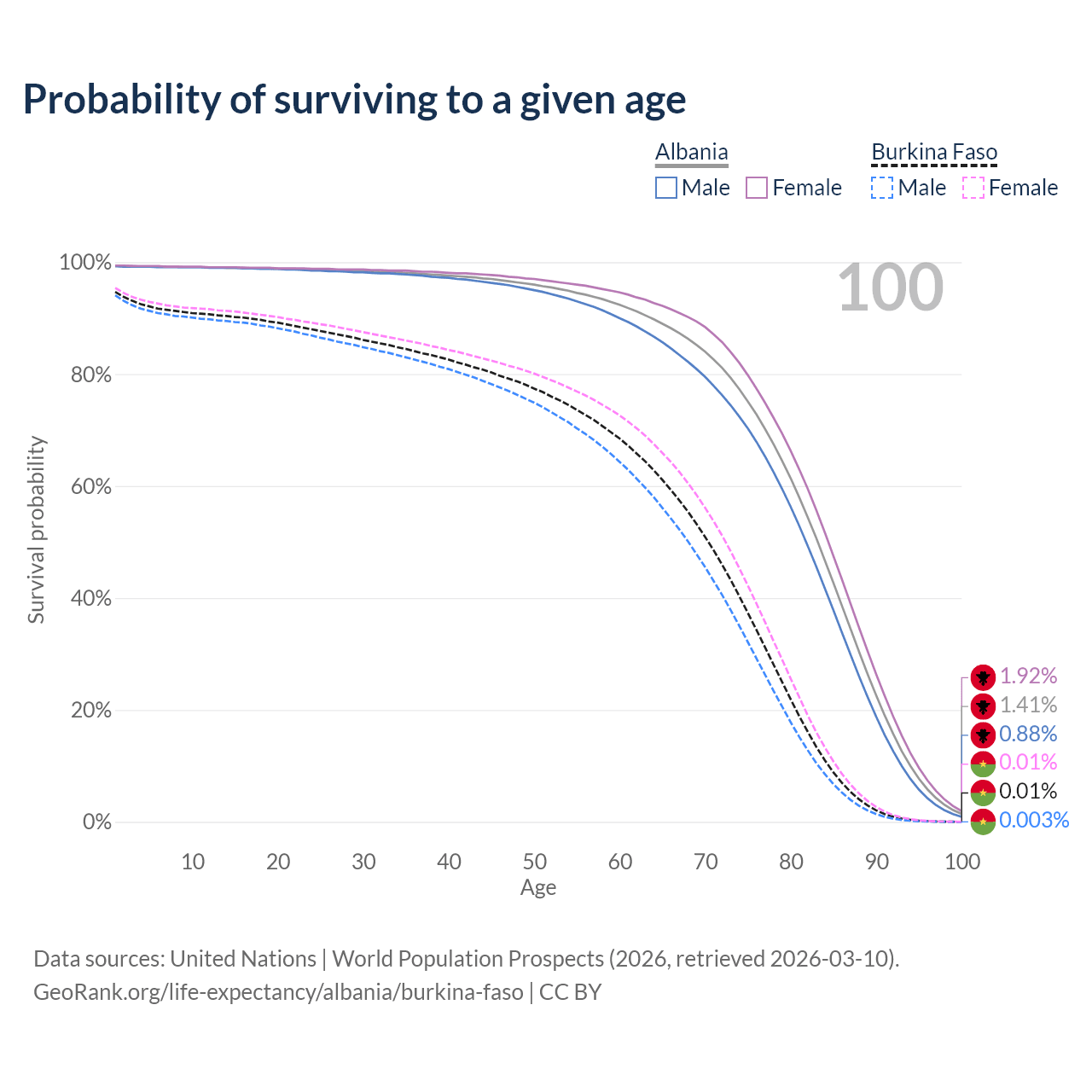 This life expectancy calculator shows the odds of living to 100, 95, 90, and below based on current age for both males and females in Albania and Burkina Faso, along with mean and median age of death. The calculations are based on the 2026 life tables (actuarial tables) from the UN World Population Prospects.
