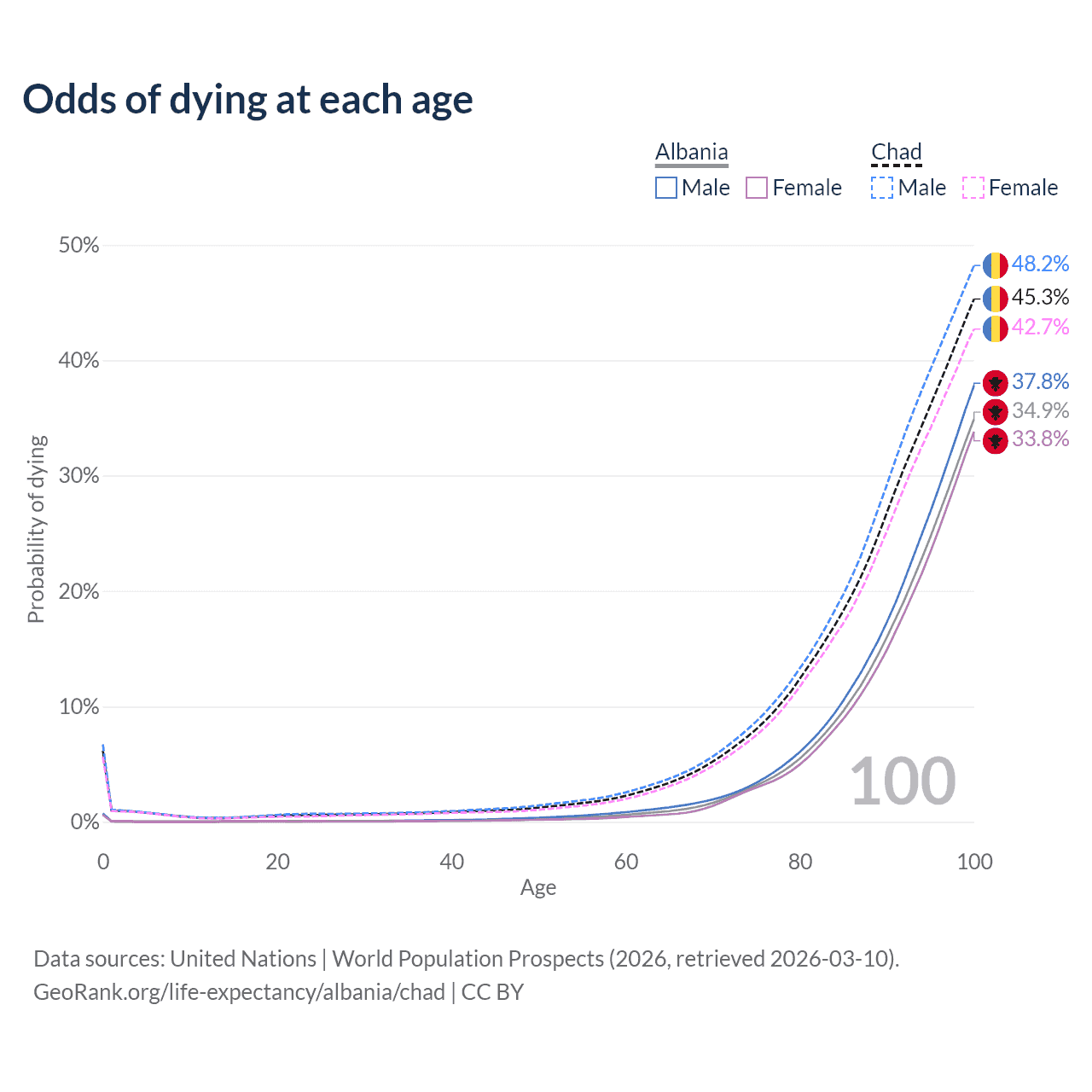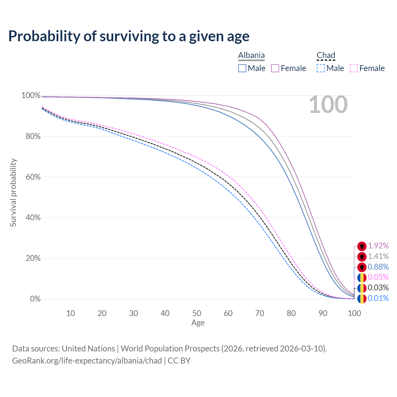 This life expectancy calculator shows the odds of living to 100, 95, 90, and below based on current age for both males and females in Albania and Chad, along with mean and median age of death. The calculations are based on the 2026 life tables (actuarial tables) from the UN World Population Prospects.