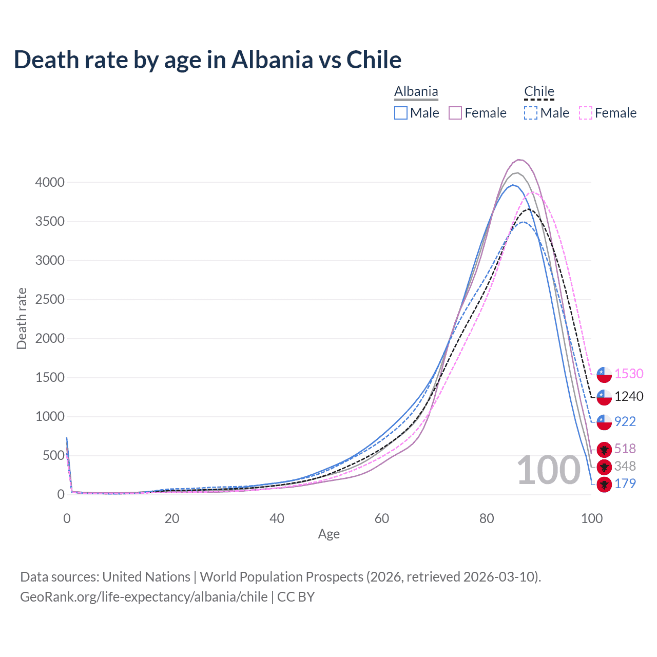 In Albania, the most common age of death is 86, compared to 88 in Chile. The median age of death is 83.2 in Albania and 84.8 in Chile, meaning only half of each cohort is expected to live past that age.