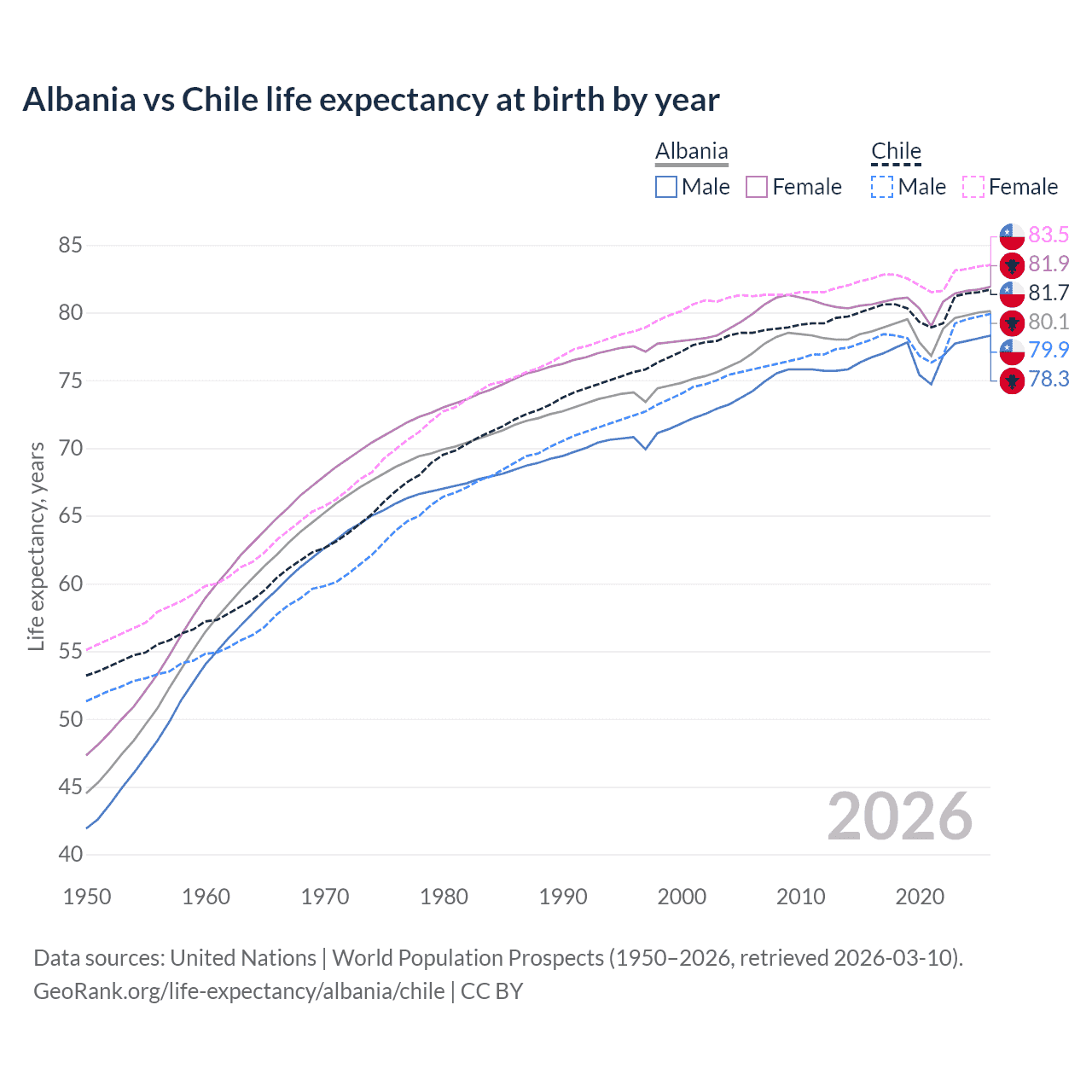 The average life expectancy at birth is 80.1 years in Albania vs 81.7 in Chile. Albania is ranked 46/197 by life expectancy, and Chile is 38/197. In Albania, the life expectancy is 78.3 years for males and 81.9 years for females. In Chile, it's 79.9 years for males and 83.5 years for females.