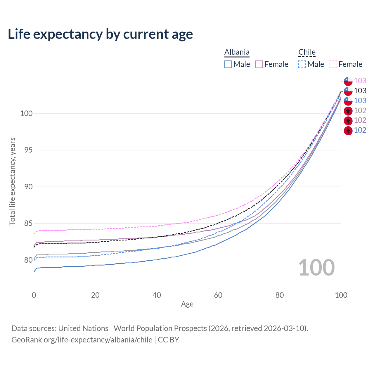 This life expectancy calculator shows the odds of living to 100, 95, 90, and below based on current age for both males and females in Albania and Chile, along with mean and median age of death. The calculations are based on the 2026 life tables (actuarial tables) from the UN World Population Prospects.