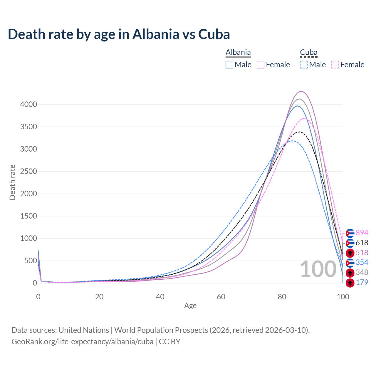 This life expectancy calculator shows the odds of living to 100, 95, 90, and below based on current age for both males and females in Albania and Cuba, along with mean and median age of death. The calculations are based on the 2026 life tables (actuarial tables) from the UN World Population Prospects.