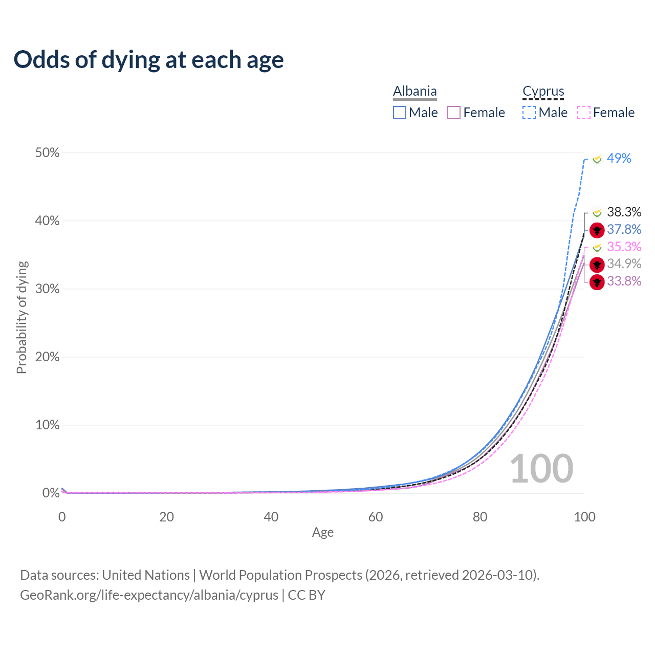 This life expectancy calculator shows the odds of living to 100, 95, 90, and below based on current age for both males and females in Albania and Cyprus, along with mean and median age of death. The calculations are based on the 2026 life tables (actuarial tables) from the UN World Population Prospects.