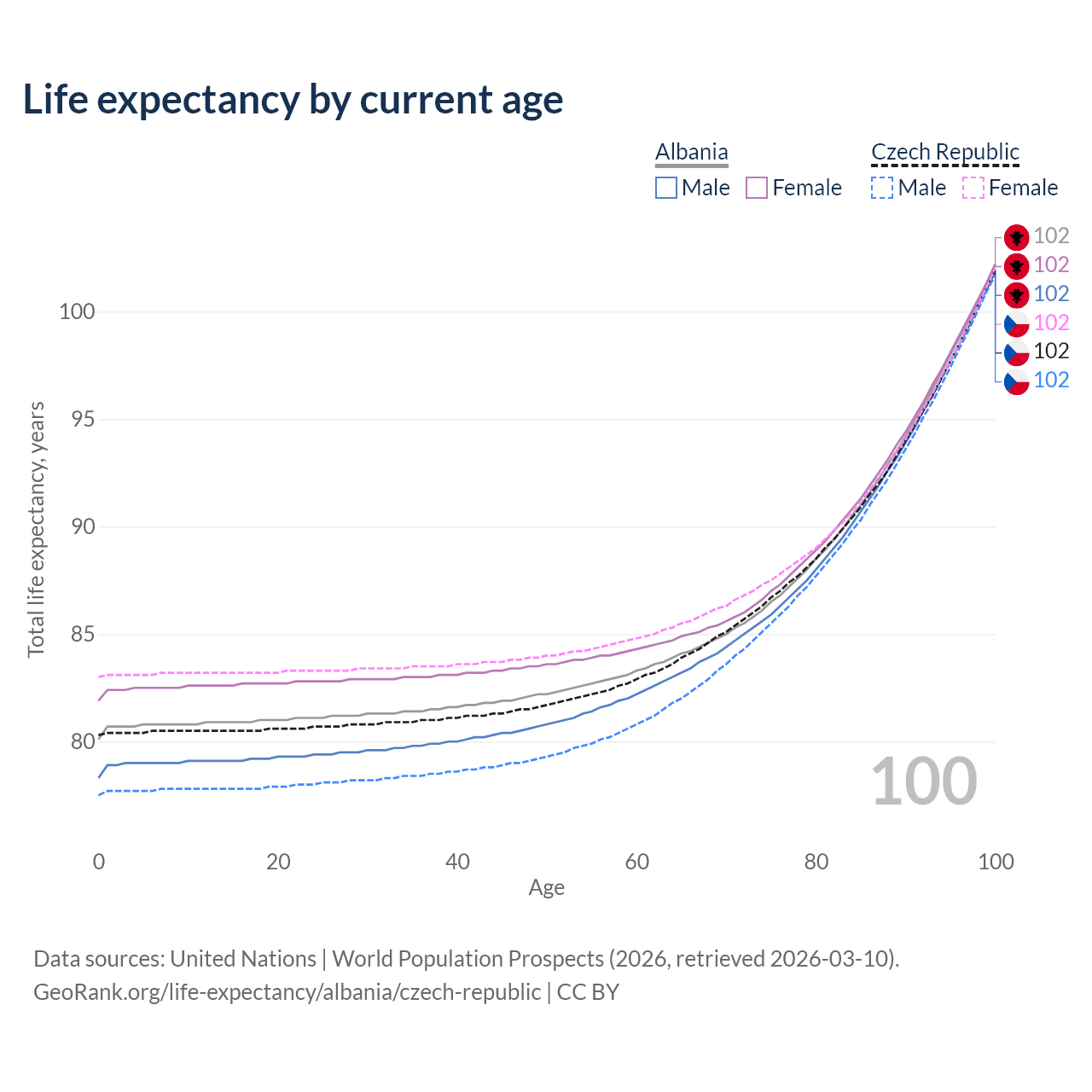 This life expectancy calculator shows the odds of living to 100, 95, 90, and below based on current age for both males and females in Albania and the Czech Republic, along with mean and median age of death. The calculations are based on the 2026 life tables (actuarial tables) from the UN World Population Prospects.