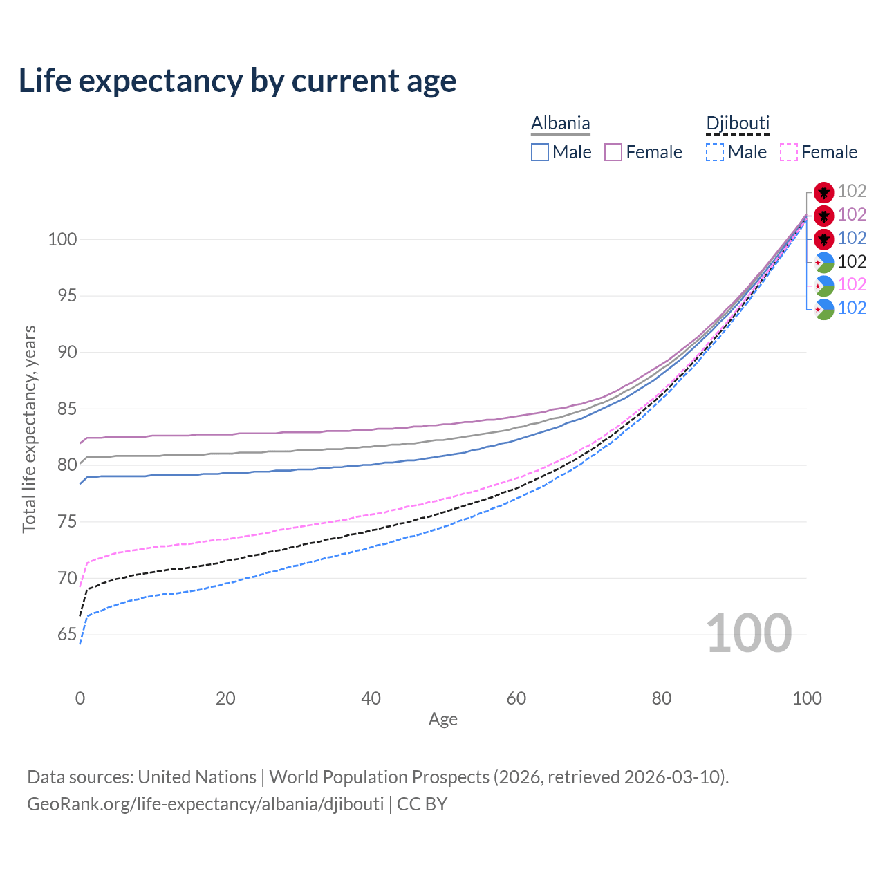 This life expectancy calculator shows the odds of living to 100, 95, 90, and below based on current age for both males and females in Albania and Djibouti, along with mean and median age of death. The calculations are based on the 2026 life tables (actuarial tables) from the UN World Population Prospects.