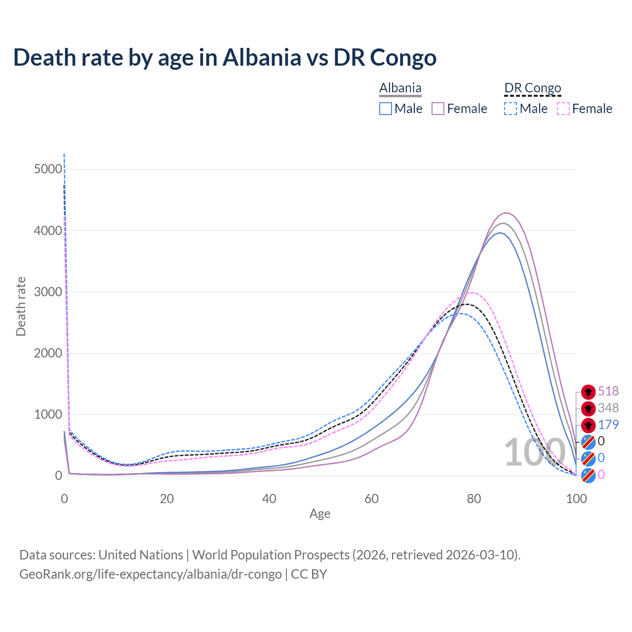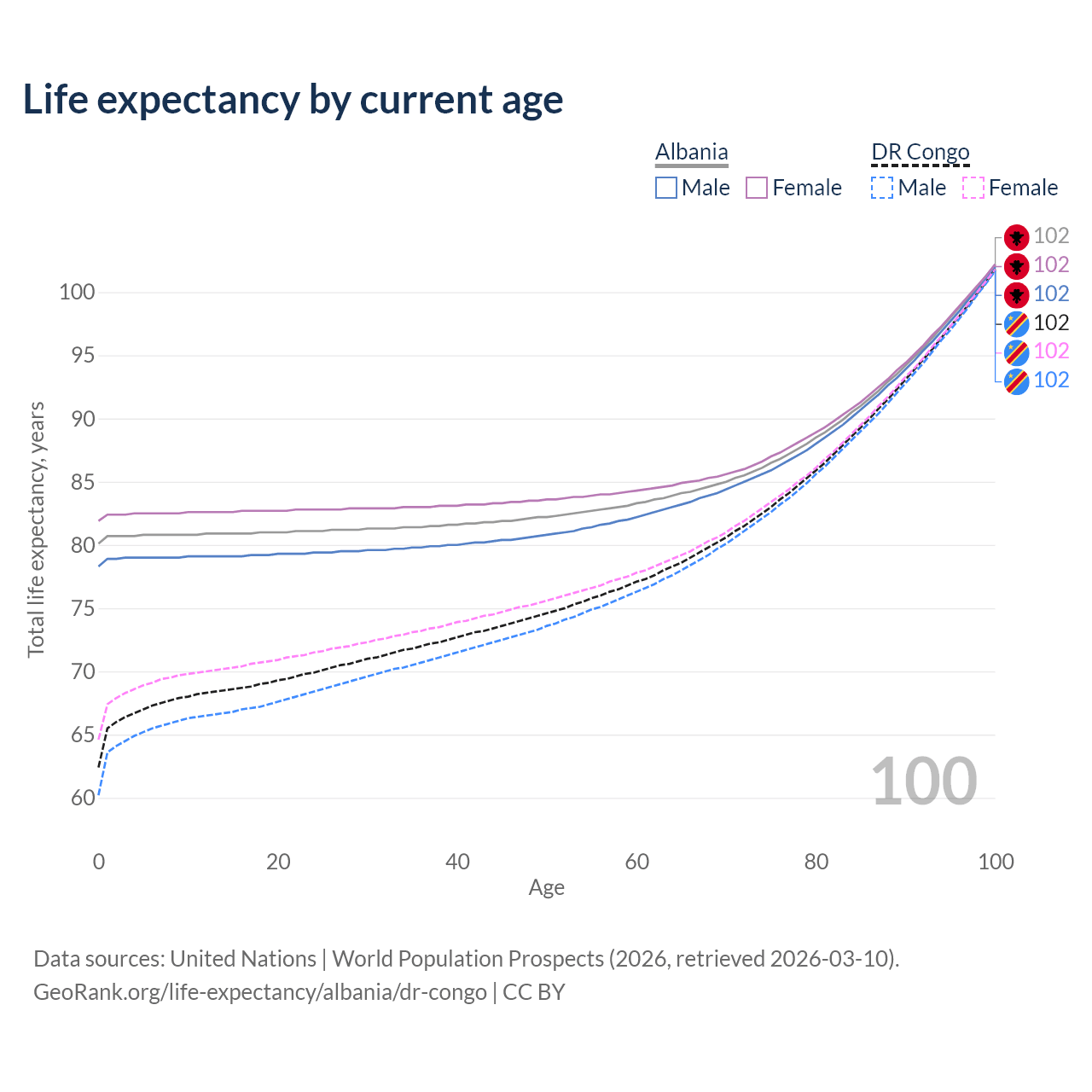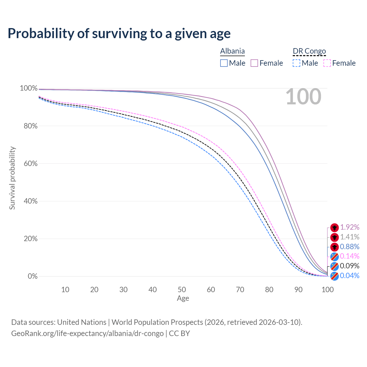 This life expectancy calculator shows the odds of living to 100, 95, 90, and below based on current age for both males and females in Albania and the DR Congo, along with mean and median age of death. The calculations are based on the 2026 life tables (actuarial tables) from the UN World Population Prospects.