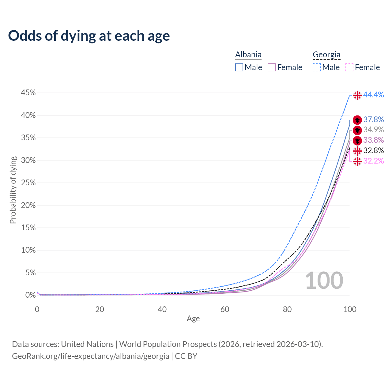 This life expectancy calculator shows the odds of living to 100, 95, 90, and below based on current age for both males and females in Albania and Georgia, along with mean and median age of death. The calculations are based on the 2026 life tables (actuarial tables) from the UN World Population Prospects.