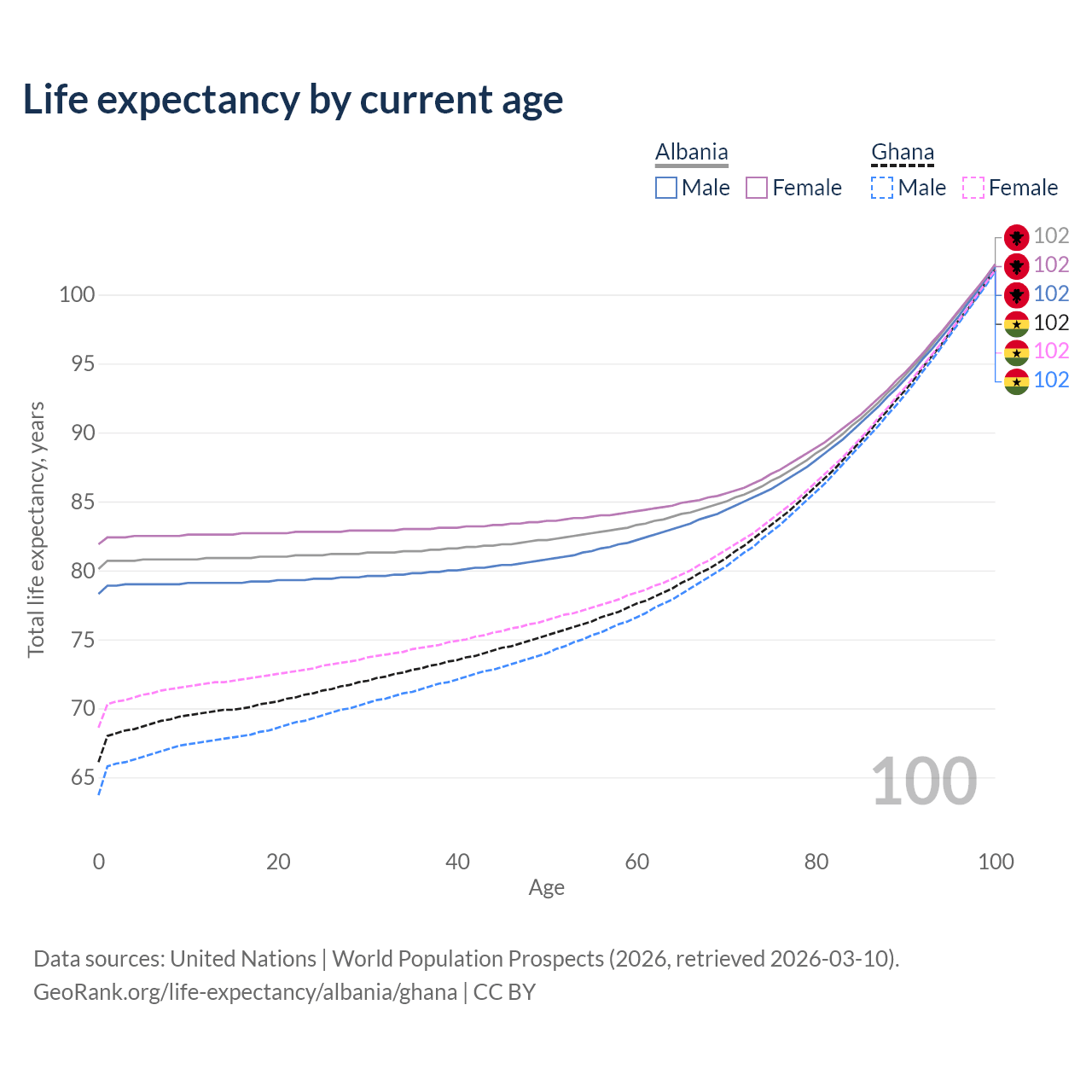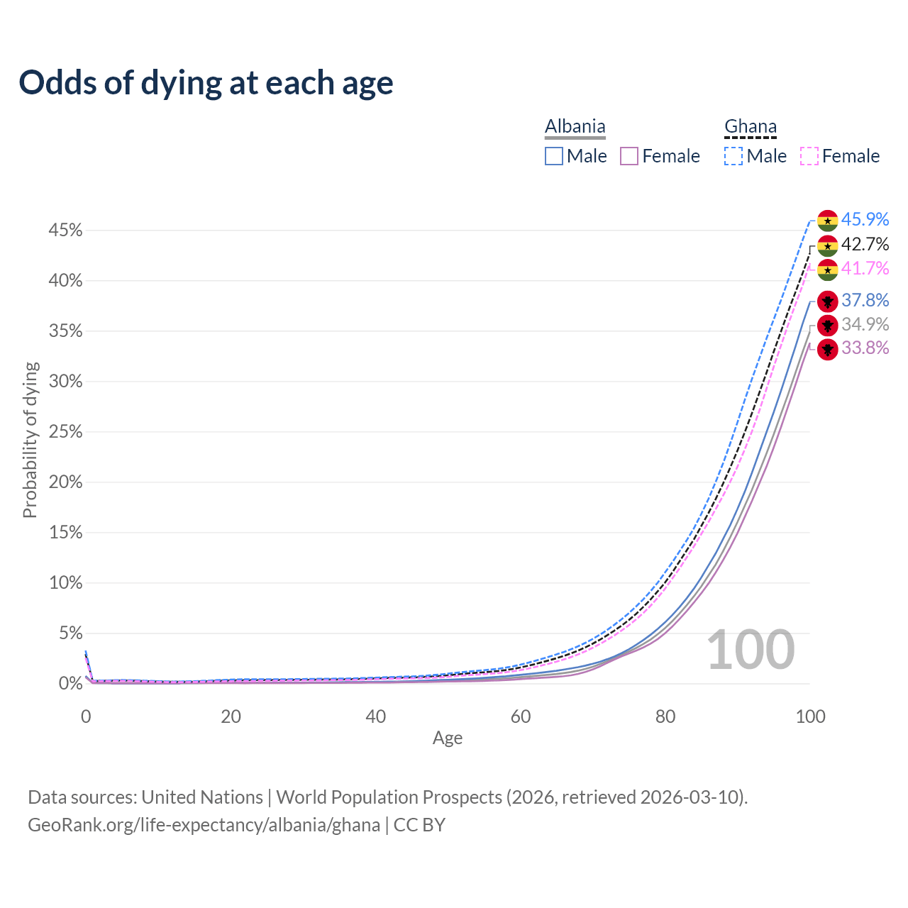 This life expectancy calculator shows the odds of living to 100, 95, 90, and below based on current age for both males and females in Albania and Ghana, along with mean and median age of death. The calculations are based on the 2026 life tables (actuarial tables) from the UN World Population Prospects.