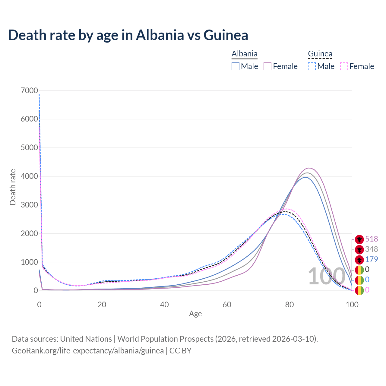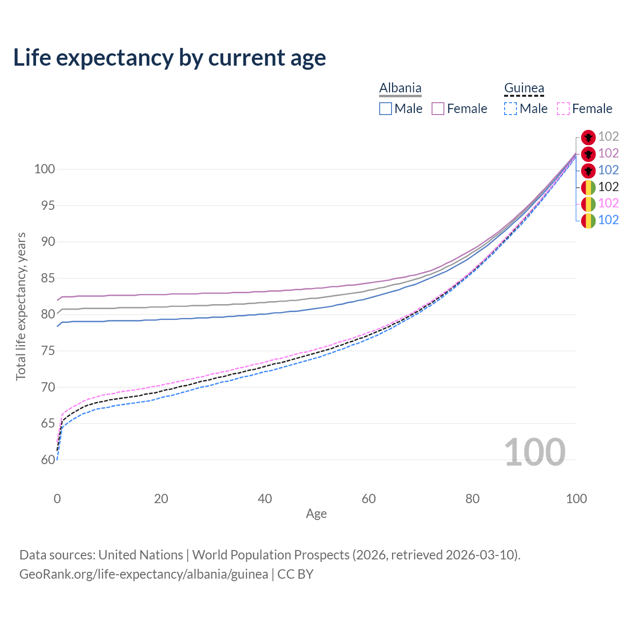 This life expectancy calculator shows the odds of living to 100, 95, 90, and below based on current age for both males and females in Albania and Guinea, along with mean and median age of death. The calculations are based on the 2026 life tables (actuarial tables) from the UN World Population Prospects.