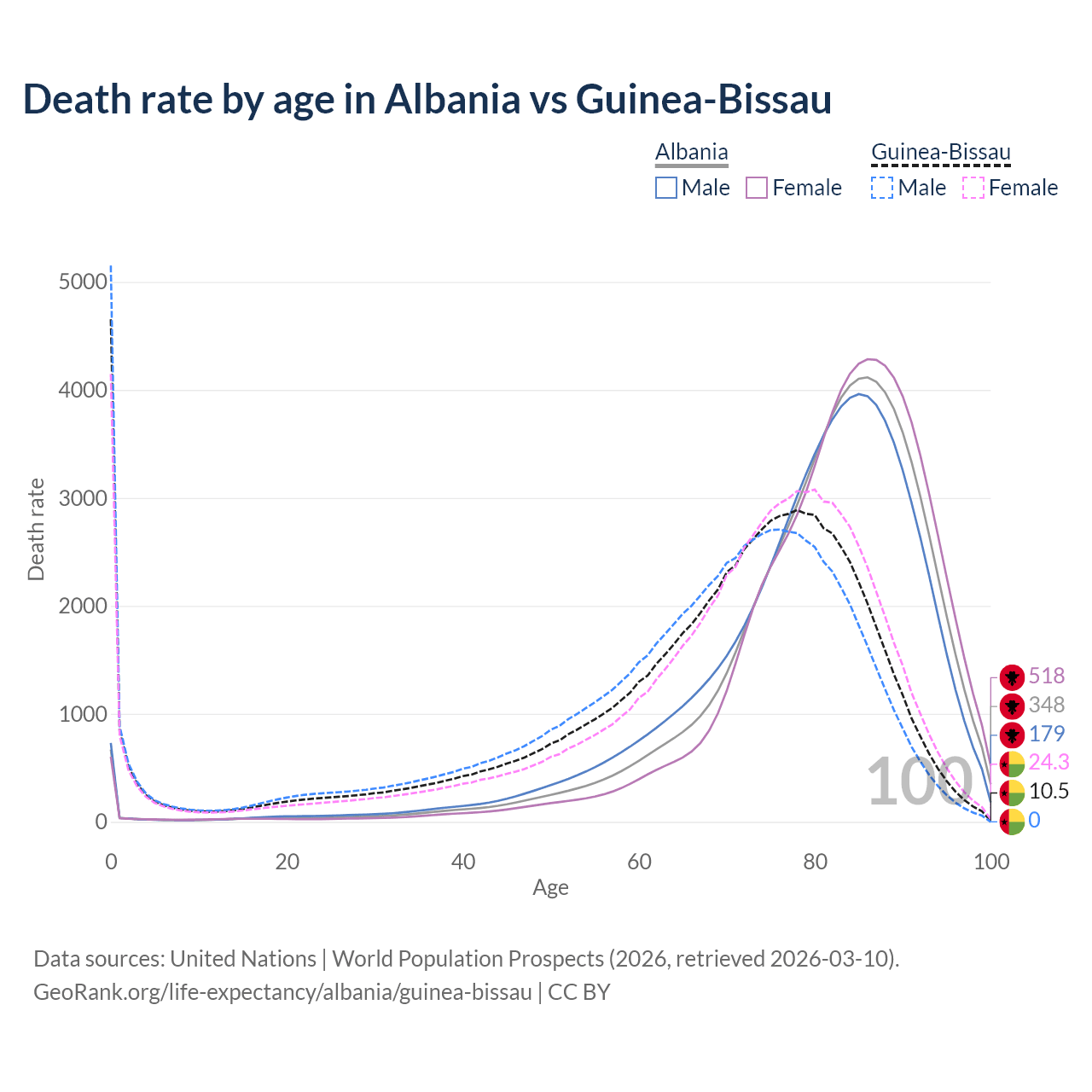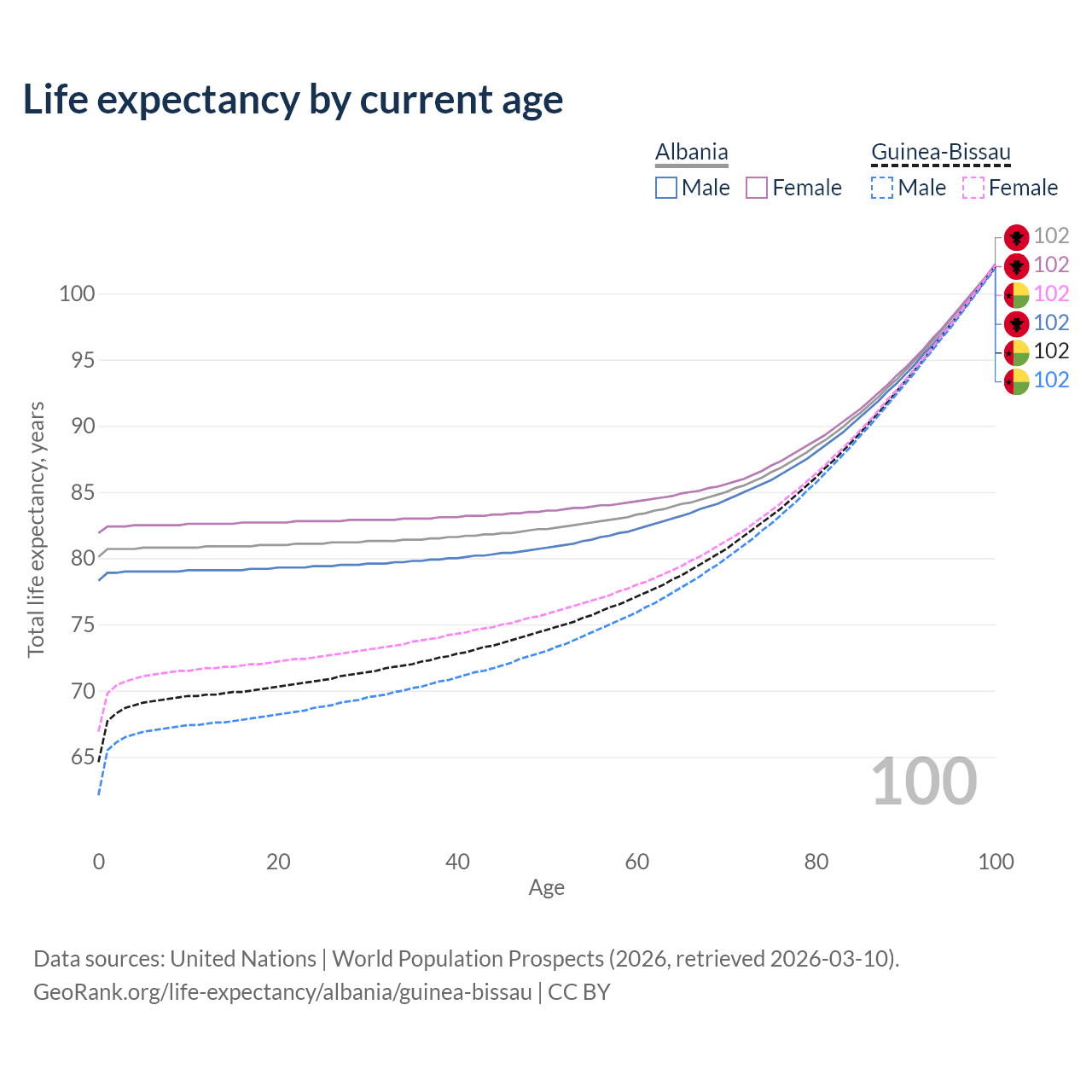 This life expectancy calculator shows the odds of living to 100, 95, 90, and below based on current age for both males and females in Albania and Guinea-Bissau, along with mean and median age of death. The calculations are based on the 2026 life tables (actuarial tables) from the UN World Population Prospects.