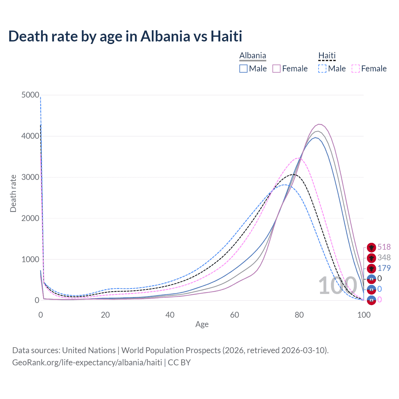 In Albania, the most common age of death is 86, compared to 0 in Haiti. The median age of death is 83.2 in Albania and 72 in Haiti, meaning only half of each cohort is expected to live past that age.