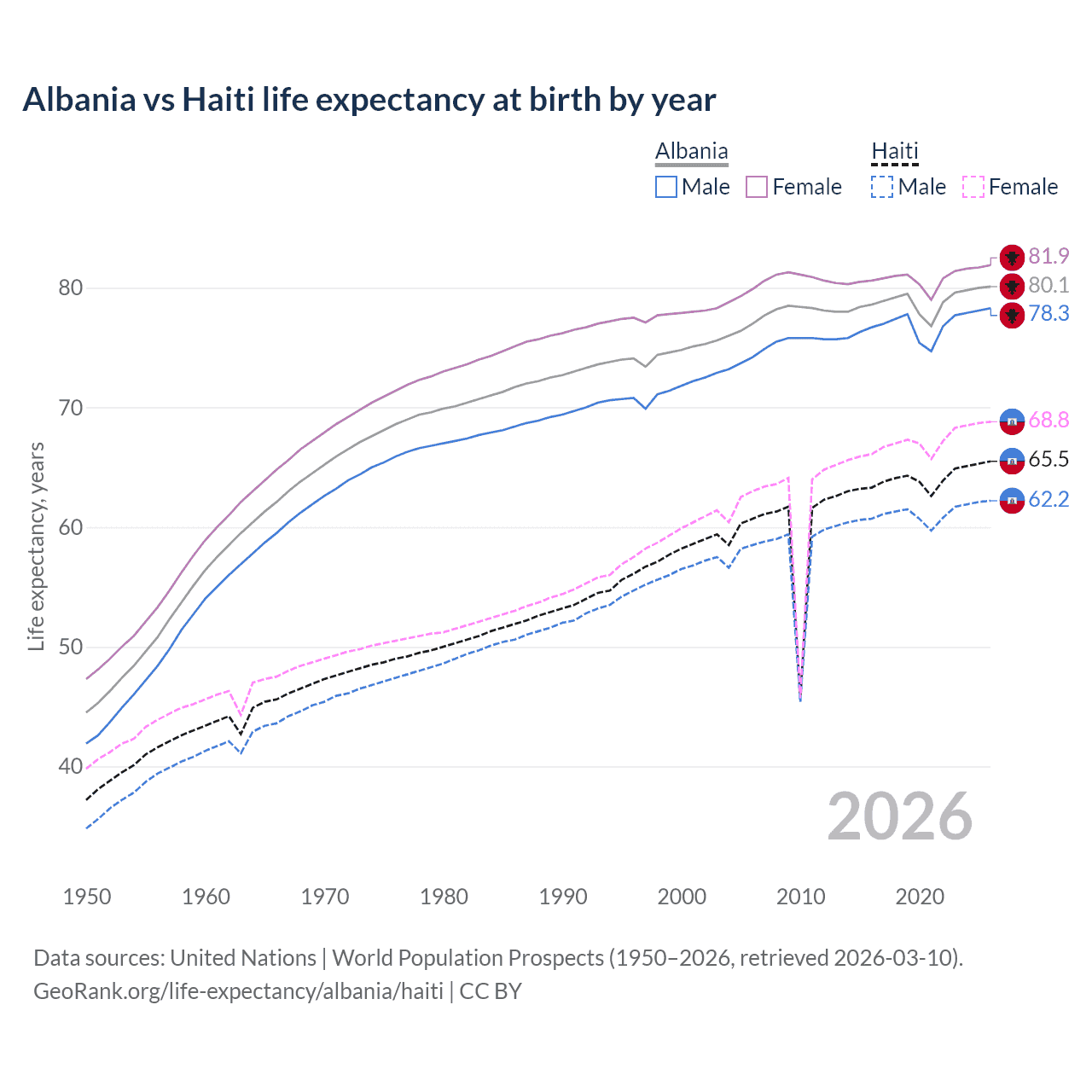 The average life expectancy at birth is 80.1 years in Albania vs 65.5 in Haiti. Albania is ranked 46/197 by life expectancy, and Haiti is 170/197. In Albania, the life expectancy is 78.3 years for males and 81.9 years for females. In Haiti, it's 62.2 years for males and 68.8 years for females.