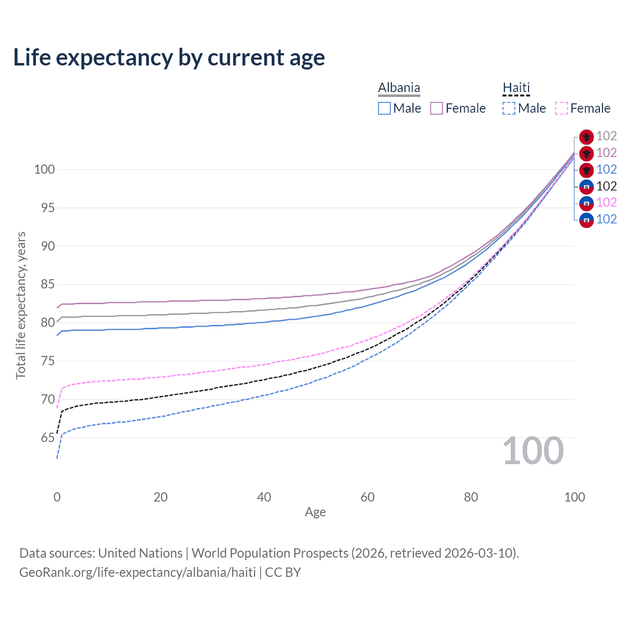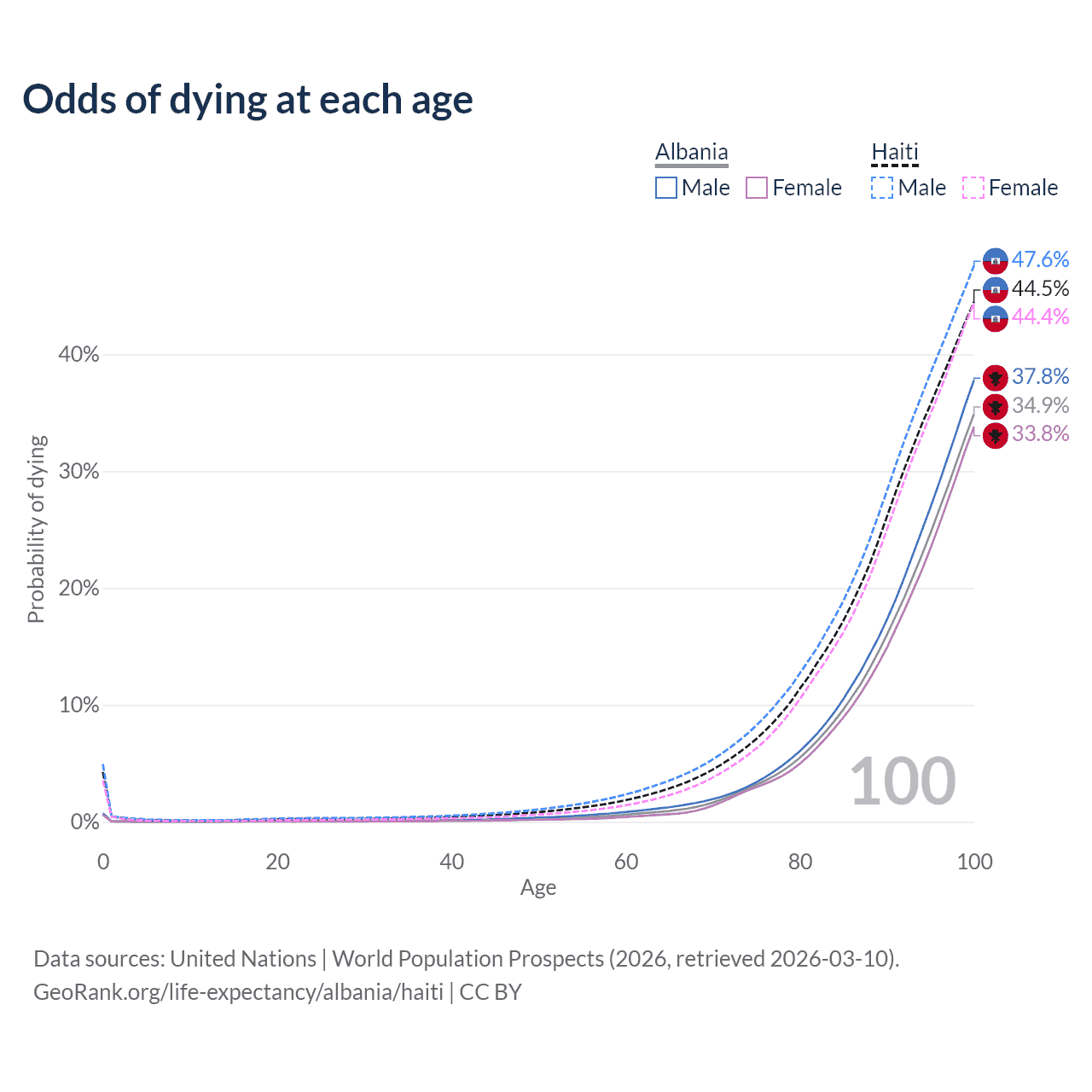 This life expectancy calculator shows the odds of living to 100, 95, 90, and below based on current age for both males and females in Albania and Haiti, along with mean and median age of death. The calculations are based on the 2026 life tables (actuarial tables) from the UN World Population Prospects.