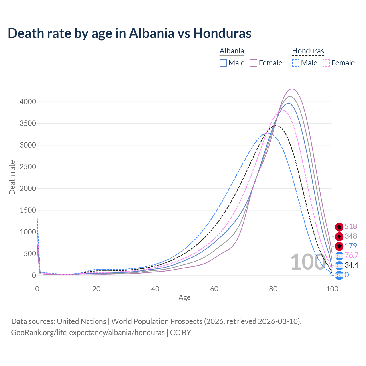 In Albania, the most common age of death is 86, compared to 81 in Honduras. The median age of death is 83.2 in Albania and 77.1 in Honduras, meaning only half of each cohort is expected to live past that age.