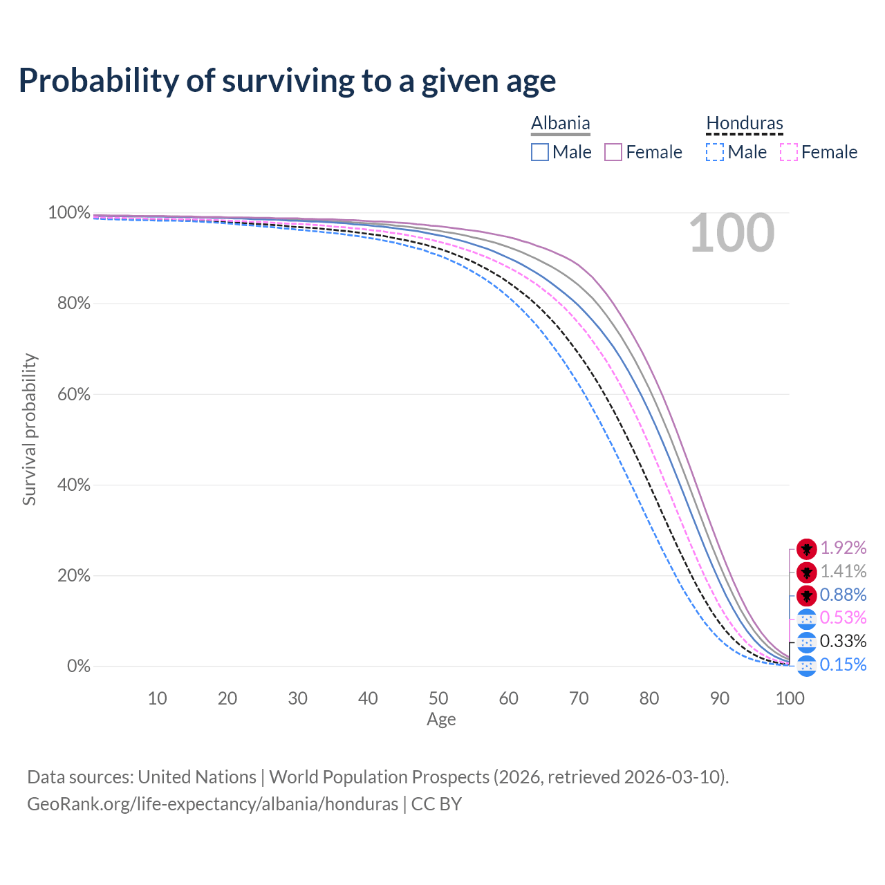 This life expectancy calculator shows the odds of living to 100, 95, 90, and below based on current age for both males and females in Albania and Honduras, along with mean and median age of death. The calculations are based on the 2026 life tables (actuarial tables) from the UN World Population Prospects.