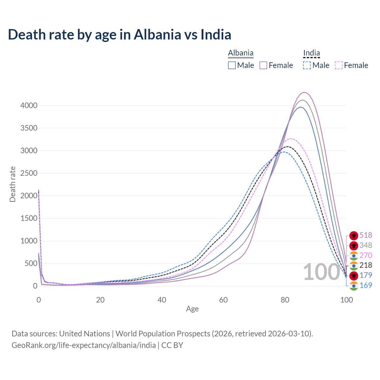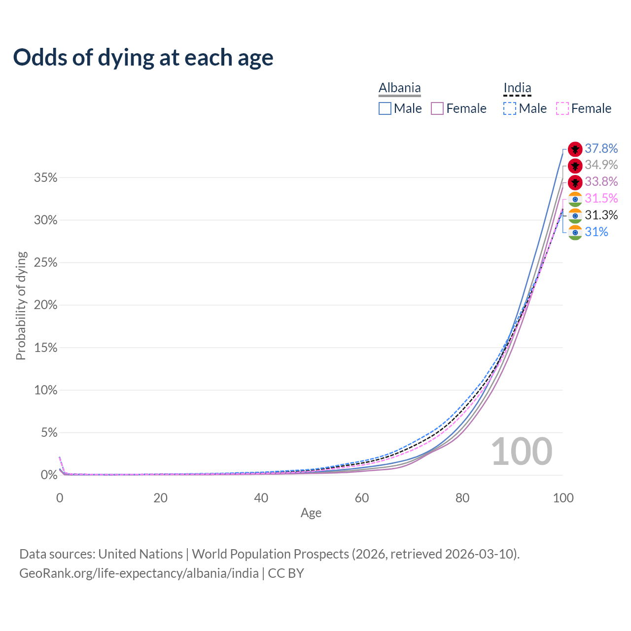 This life expectancy calculator shows the odds of living to 100, 95, 90, and below based on current age for both males and females in Albania and India, along with mean and median age of death. The calculations are based on the 2026 life tables (actuarial tables) from the UN World Population Prospects.