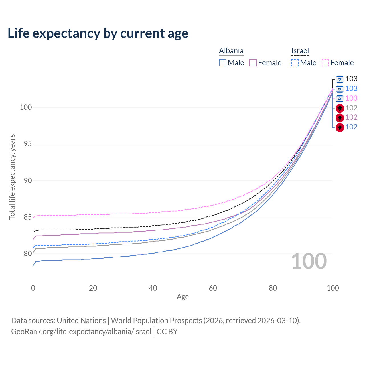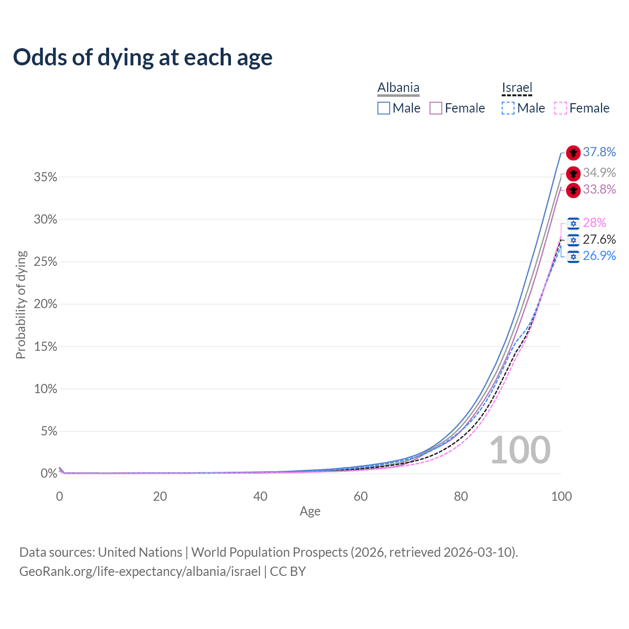 This life expectancy calculator shows the odds of living to 100, 95, 90, and below based on current age for both males and females in Albania and Israel, along with mean and median age of death. The calculations are based on the 2026 life tables (actuarial tables) from the UN World Population Prospects.