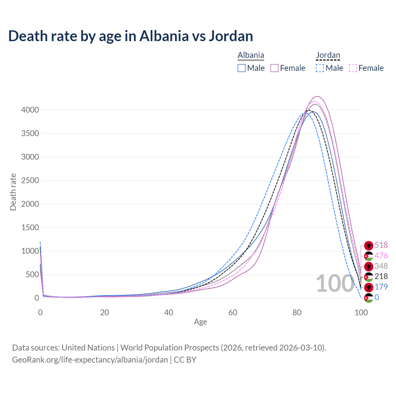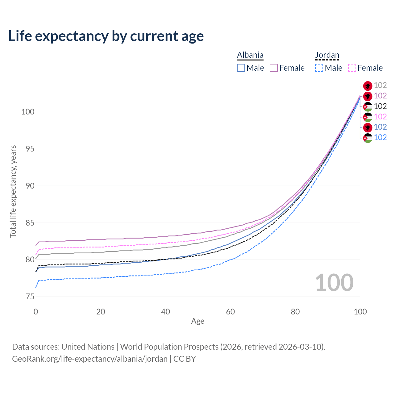 This life expectancy calculator shows the odds of living to 100, 95, 90, and below based on current age for both males and females in Albania and Jordan, along with mean and median age of death. The calculations are based on the 2026 life tables (actuarial tables) from the UN World Population Prospects.