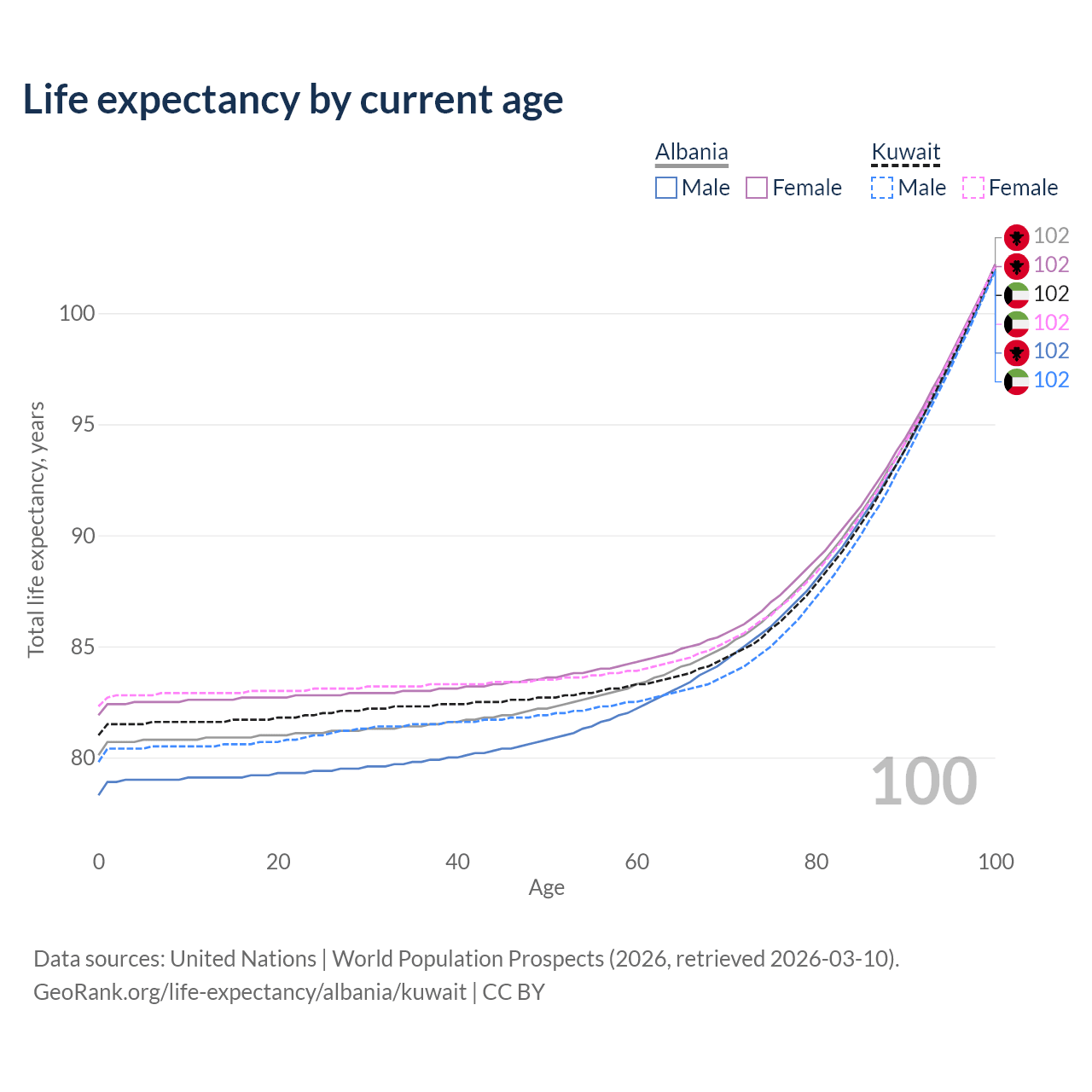This life expectancy calculator shows the odds of living to 100, 95, 90, and below based on current age for both males and females in Albania and Kuwait, along with mean and median age of death. The calculations are based on the 2026 life tables (actuarial tables) from the UN World Population Prospects.