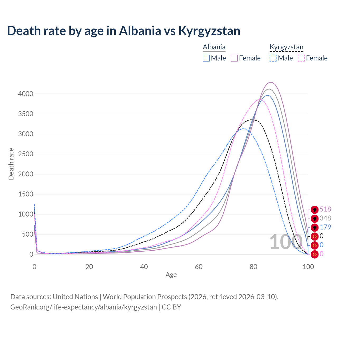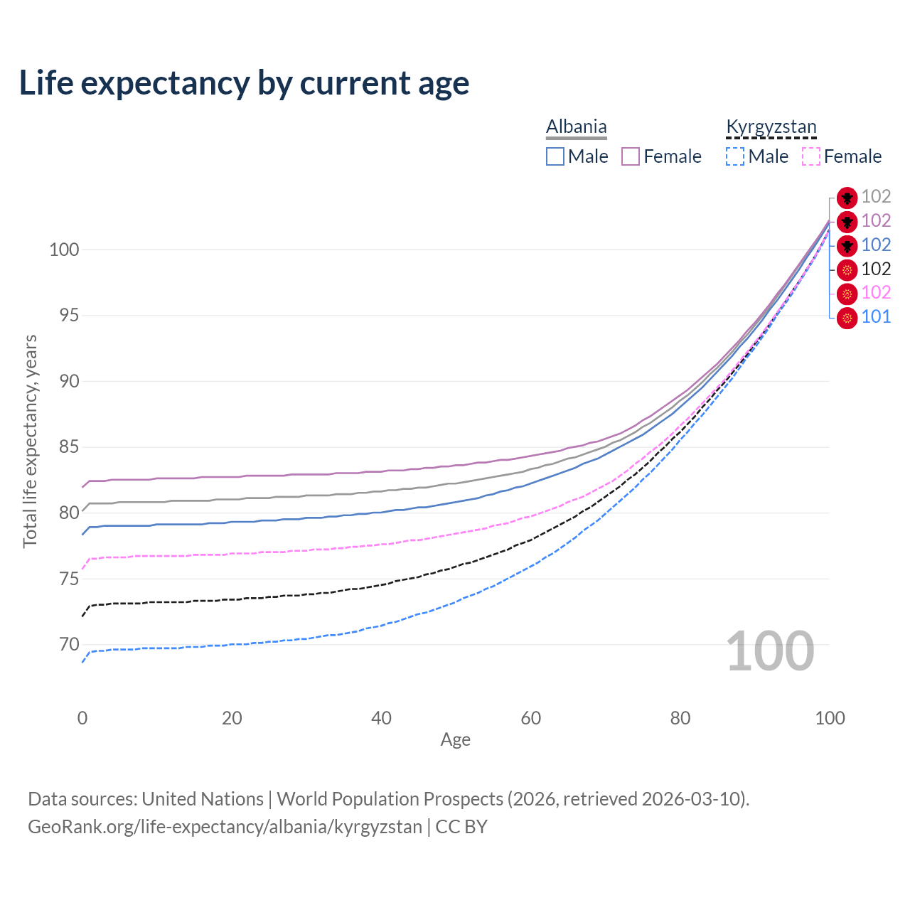This life expectancy calculator shows the odds of living to 100, 95, 90, and below based on current age for both males and females in Albania and Kyrgyzstan, along with mean and median age of death. The calculations are based on the 2026 life tables (actuarial tables) from the UN World Population Prospects.