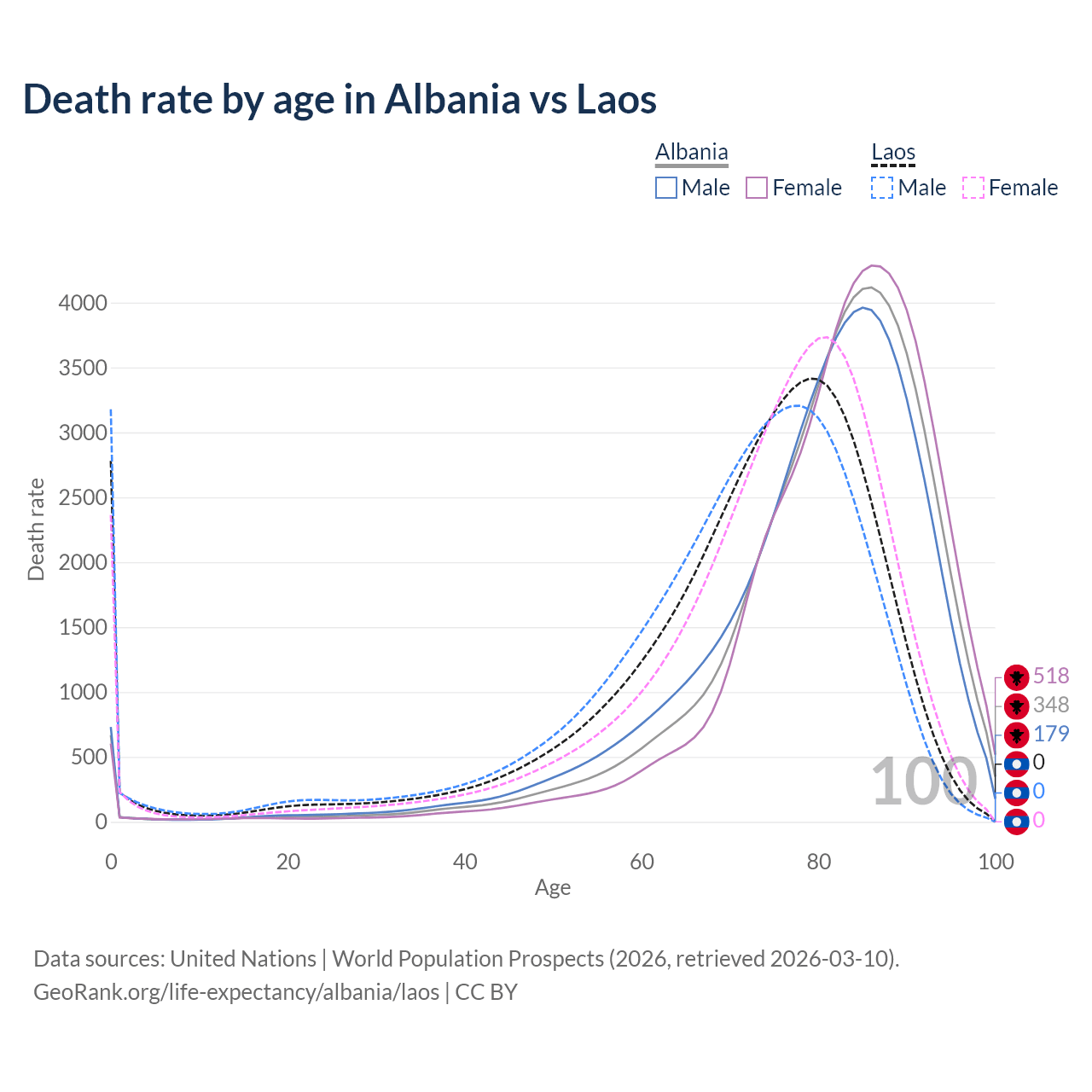 In Albania, the most common age of death is 86, compared to 79 in Laos. The median age of death is 83.2 in Albania and 74.7 in Laos, meaning only half of each cohort is expected to live past that age.